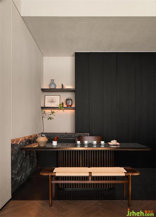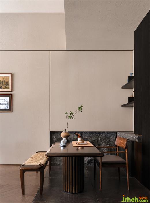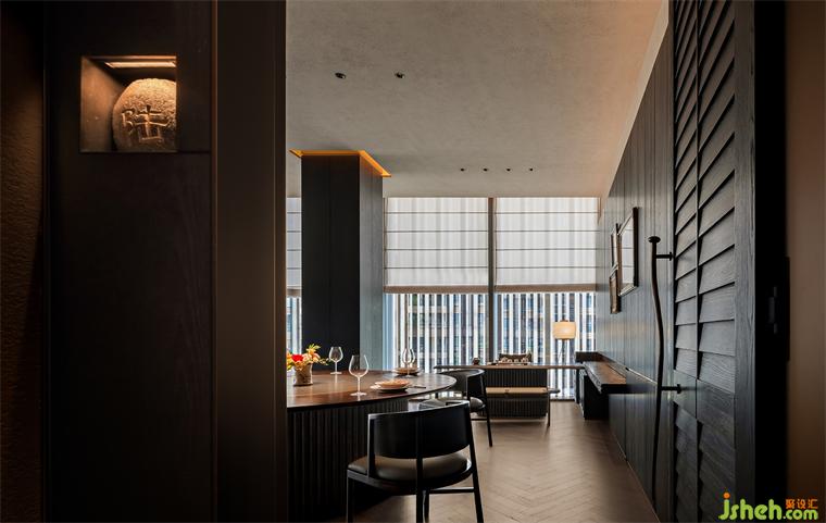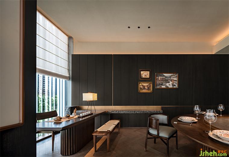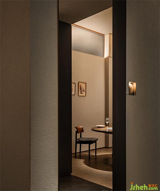 沿走廊至包房,石板砖附着一层油润的薄光,漫漫层叠的黄土是视线尽头的地理造像。枝形黄铜把手后,包房像一段上扬的乐章作为空间的终段。洁净的材料几乎不饰一物,在静定朴拙的背景下,天光和城市从落地窗中叠映进室内,组成了一个完整的新世界。