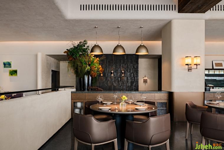 经酒柜、吧台、冰档与明档,散座区豁然开朗,自然光与内部更适合就餐的灯光彼此作用带来了跃动变幻的光影,老榆木包覆的天花与立面和现代肌理穿插共构。建筑、风味、故事在此刻的相遇中激荡起情绪的海浪。