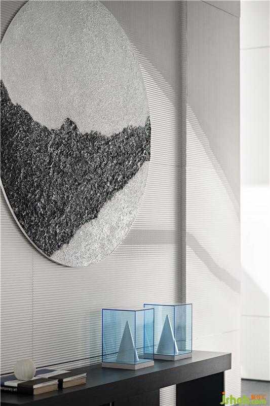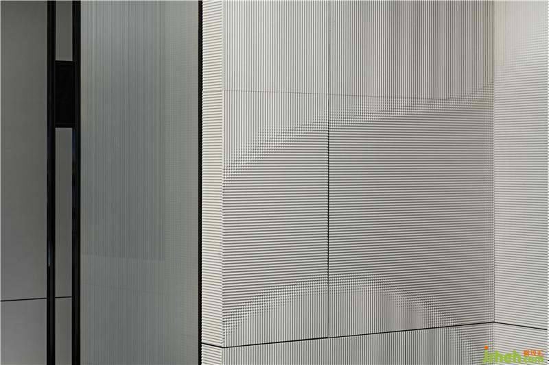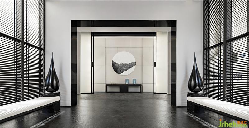 墨者,无色,亦五色也。入口处横叠着的石台,以浓墨润之,漾开,有褶皱,有起伏,有显有藏。走近一些,可见墨纹、涟漪,丝丝缕动,似乎要更浅些,如淡墨般,此番便为知黑。大面积的墙体守白作为墨之五色中的“清”来对待,只余一些隐约漾着的墨影。胡桃木和暖光灯的穿插平衡了空间中浓与清之间的体验感。