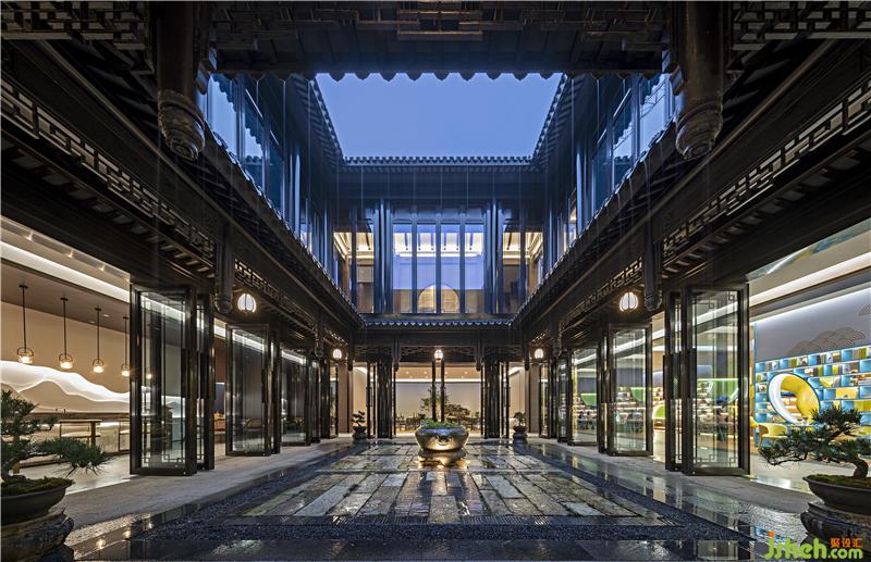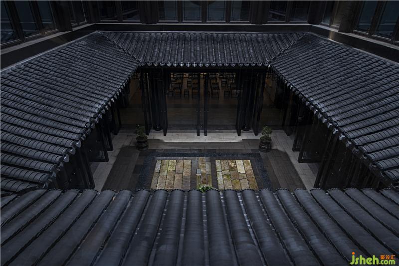 建筑的屋檐四面围合,承载着中国传统文化中“天人合一”的儒礼思想。天井之下四檐之上,归水层层跌落聚于庭中,天、地、人通融相契,意蕴无穷。庭院消解了建筑与天地的界限,启发受众晓悟建筑之外的无限富饶。