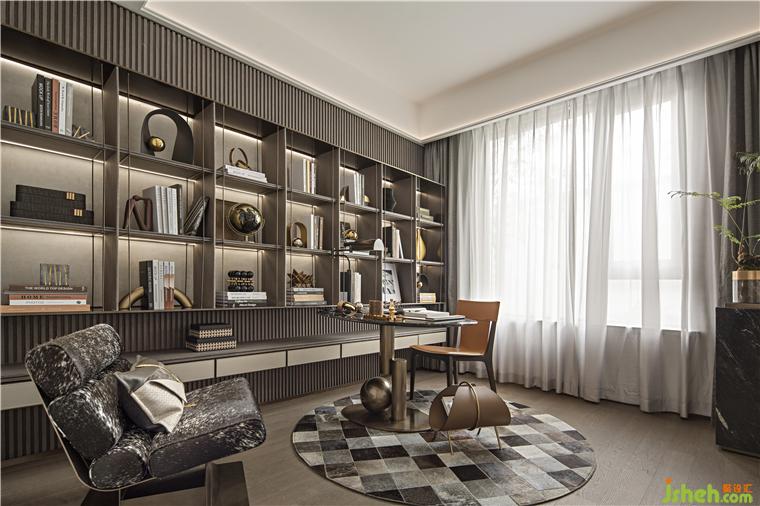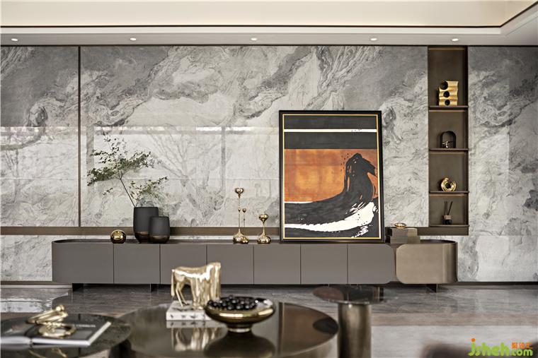 黑与金的神秘含蓄,铺展出沉稳内敛的空间基调,沙发以折线的造型曲转延伸,长沙建发养云样板房设计穿破冷静的空间氛围。