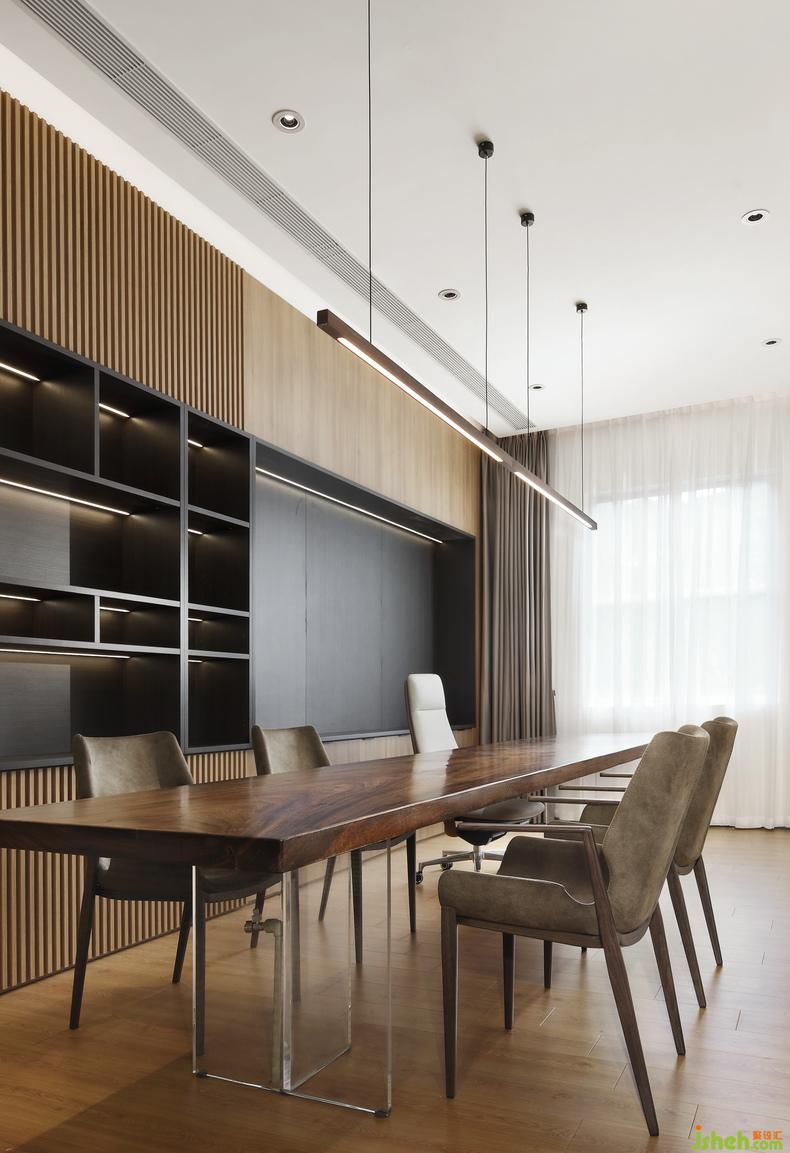 会客厅在原木色包裹之下同样令人心情放松,商务感并没有那么厚重。与之前的会客空间相比,设计师特别处理了私密与隔音的问题,且将会客的空间集中规制,统一规划,吊灯与桌椅简而不俗,尽显细节之处的严谨设计思考