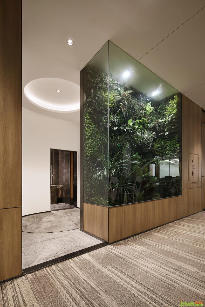 廊道一旁闪现的玻璃墙高耸,打破了原木墙面延续的格局,内置的繁茂绿植令人心神安定,自然的气息在这里被烘托得浓墨重彩