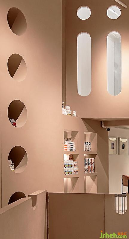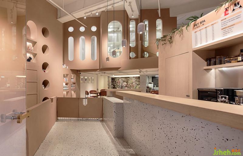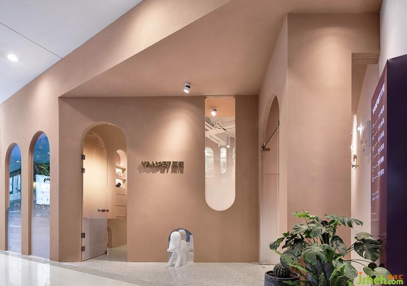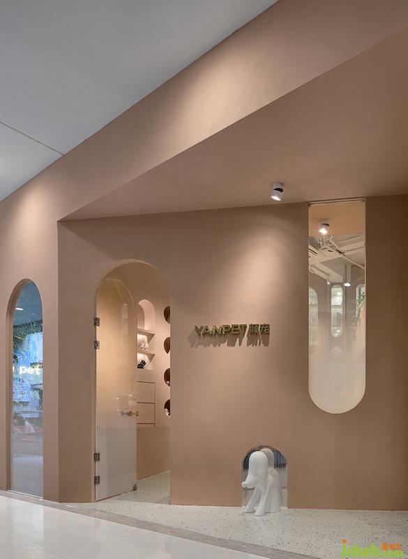 为了打破原先呆板的空间,我们将入口旋转了90°,且内退一部分空间使入口对应着真正的客流主入口,因为店铺位置处于天街和内部商铺通道的三向交汇处,如此并解决了原先店铺如何吸睛的问题,也解决了双向客流动线的问题(因为颜宠内部有3条客流主动线,一是主门进入的宠物派对活动区,二是次门进入通往一楼宠物美容区的动线,三是次门进入通往二楼的宠物寄养区。)