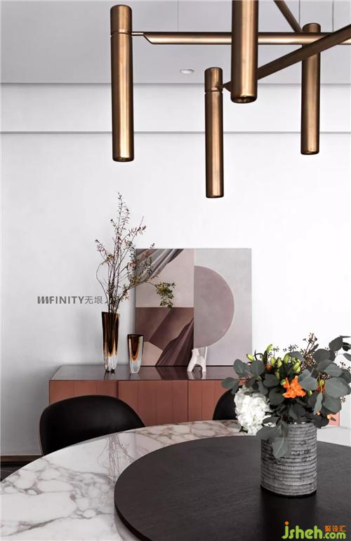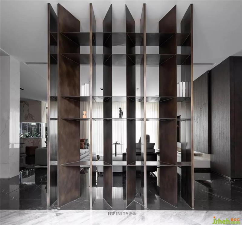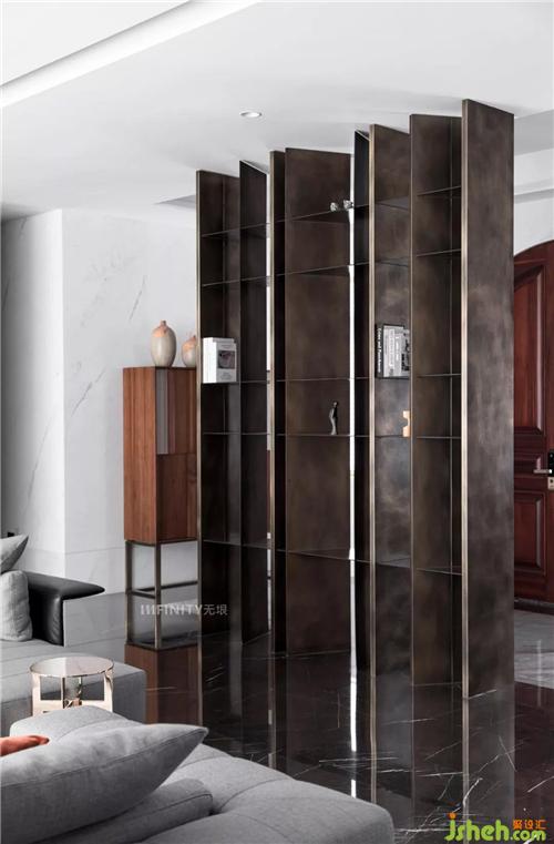 仿铜不锈钢的屏风柜,功能与美学并重,轻巧的区分玄关与客厅两个空间独立又联系的空间层次,让空间流动,灵动。
