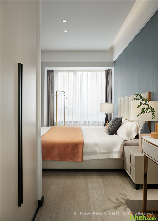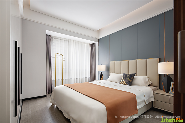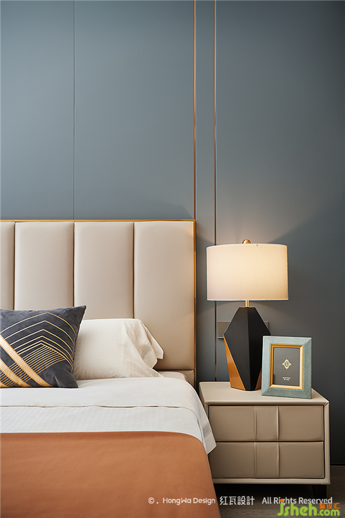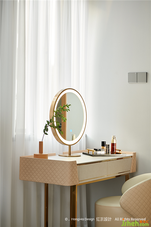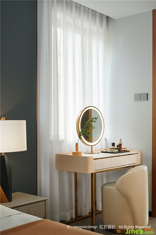 棕色床旗和金属元素修饰空间,沉稳中体现高端与时尚,梳妆台贴心的采用了皮质包边,为女主人提供舒适的护肤环境,悠闲的享受专属自己的精致时光