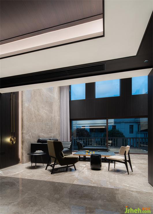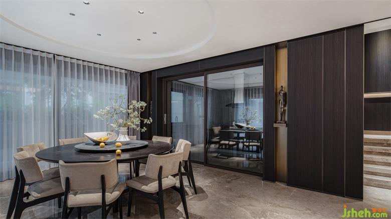 灵感源于上世纪四五十年代西方经典设计,赋予其当代东方视角,别墅装修设计柔和经典的西方设计与优雅的东方文化,交织出简洁线条,天然纹理、协调比例与温和高压的几何形态,沉淀凝结成静谧安然。
