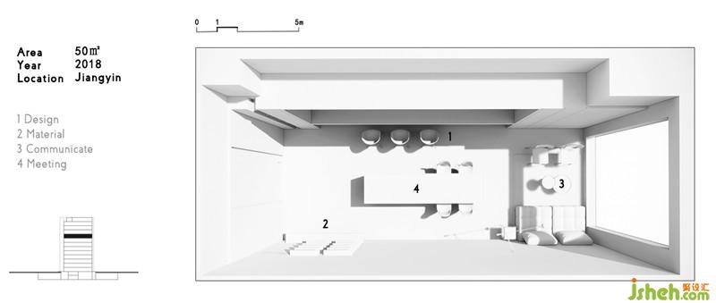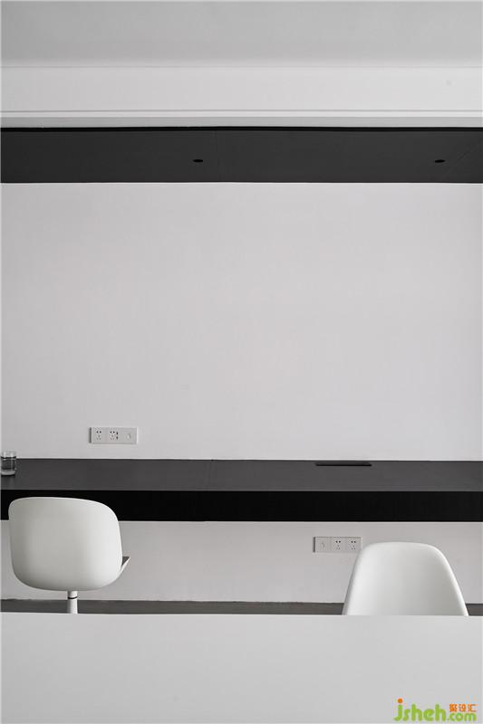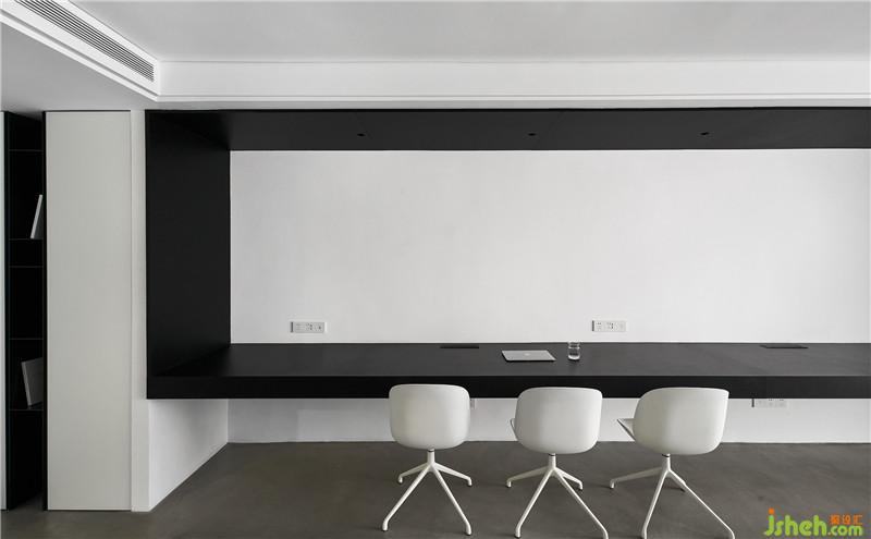 工作区域是一个盒体,黑色的体块和白色的基面,秉持着开放性、互动性的原则。黑与白,具有强烈的视觉指引,在灯光下渲染出空间的张力。在材质的规划上,地面以panDOMO为基底,木皮、钢板、乳胶漆形成界面,使整体空间融合在一起,区域与机能互动被流畅的围塑出来。长方形格局的办公空间,需对其不同区域机能进行划分,在层次上剖析、分割,进而使功能区域间相互连结,让四周重构我们需要的环形通道,以流畅的律动串联各个空间。
