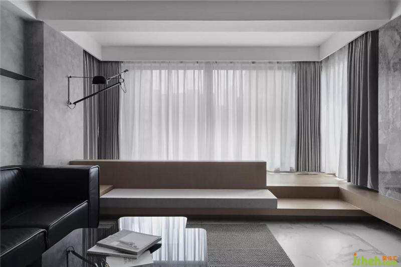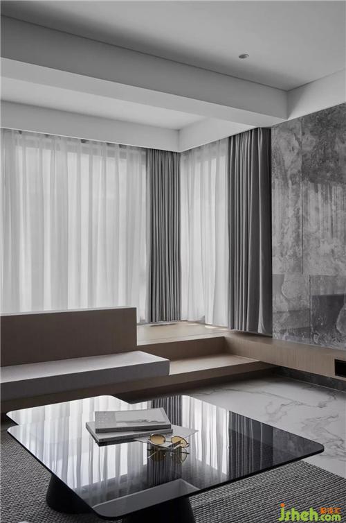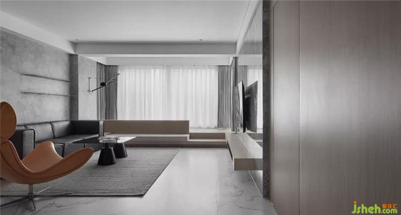 我们将电视背景墙立面造型拉平,室内设计师延伸材质致使轴线延长,将空间视觉感达到最大化。沙发背面用水泥涂料呈现手作纹路的自然与温度。我们大量使用暖色系,中和了空间彩度,以石材、木纹、艺术涂料等材质,通过大块的落地窗景,藉由光影虚实的变化,创造出安定雅致的居住氛围。