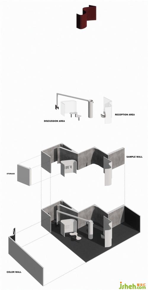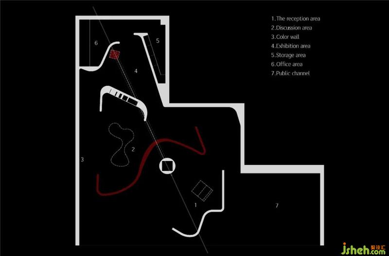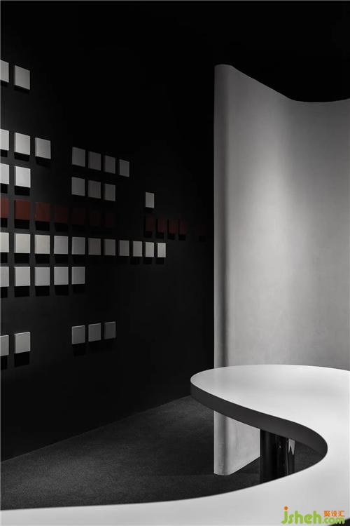 我们观察到涂料的物质形态,有着不受约束的自然张力,因此我们在空间中置入5组流动的曲线,展厅装修设计作为隔离与联系的媒介,并在陈设结构形式上继续延续这一记忆。