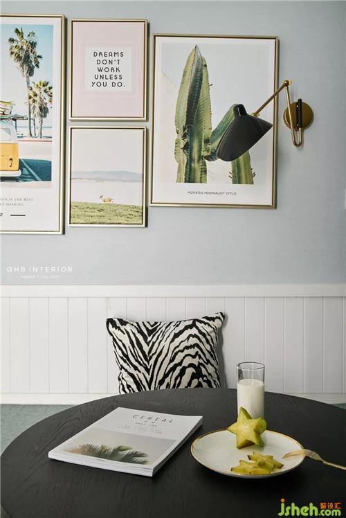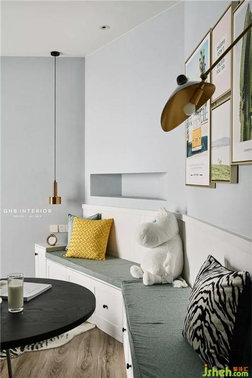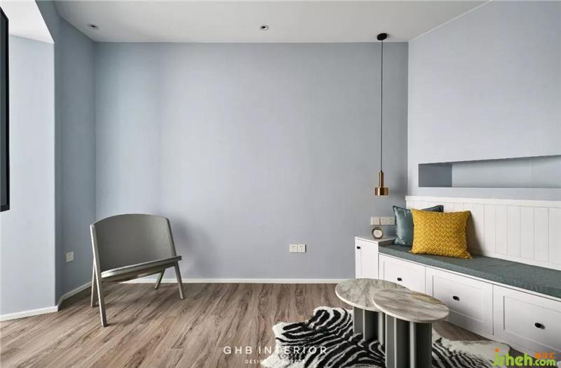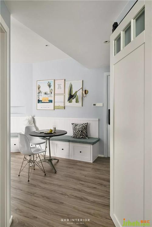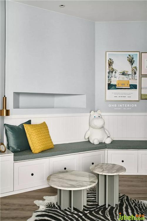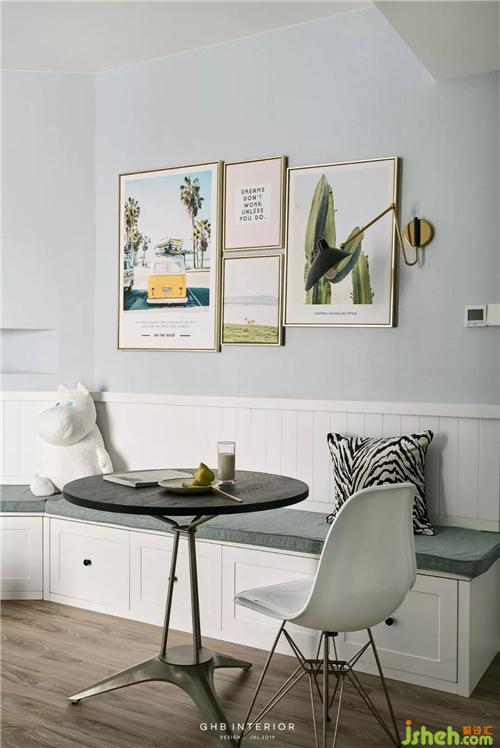 ▲ 以水色为基调,搭配木地板、白色柜体来增加空间温度,室内设计师尝试以清新趣味的家饰摆设,为疗愈系的居住空间点缀些许的活泼幸福感。