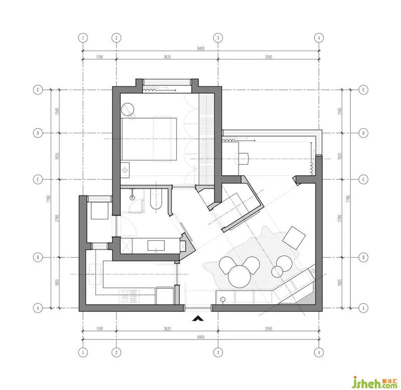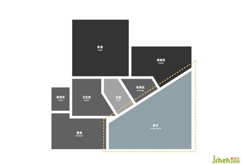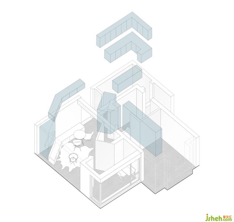 ▲ 客餐厅一体的开放式空间,使有限面积里视觉观感最大化,方块几何的变化,新生出阅读区域和大量的收纳空间,让空间场域尺度的界定被打破,区域与区域之间产生沟通与串连的属性。