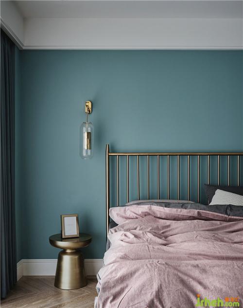 主卧拆除了原来的装饰假梁,减轻层高消耗带来的压迫感,改造后摈弃了冗杂的装饰,墙面涂漆利用青碧色营造清爽安静的睡房氛围,搭配业主喜欢的金属质感的家具与脏粉色的床品,提升睡房空间的精致度和氛围感。