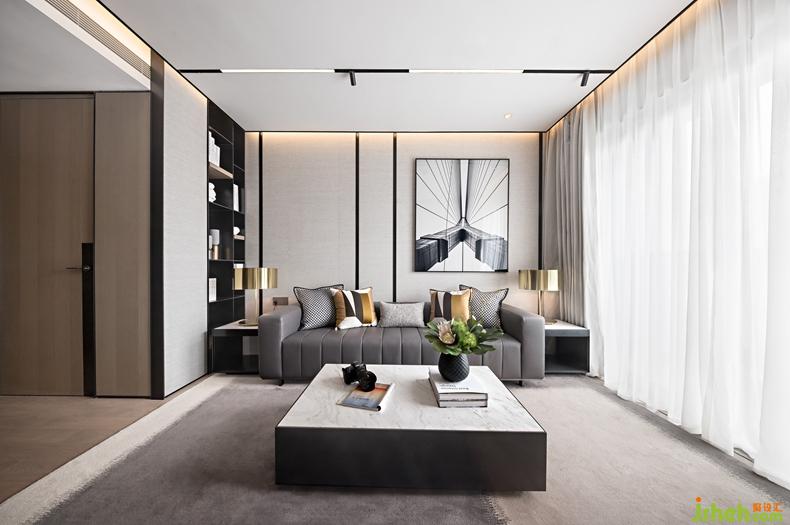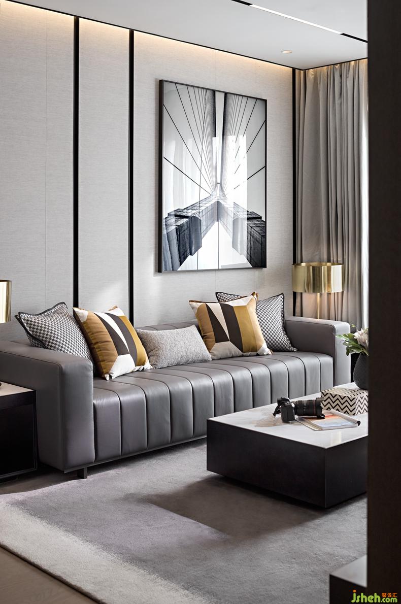 每一条线都经过精心设计,横线的平稳,竖线的冷静纵横织就了现代空间的节奏感。与之对比的是背景墙上的大幅铁桥摄影的线条发散出的张力。深圳设计公司