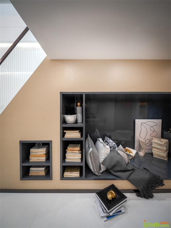 米色从玄关一路延伸至客厅,虚化了水平楼层的边界,形成和谐连贯的视觉体验。楼梯下方摒弃了寻常的柜体设计,一抹雾霾蓝强化了阅读功能区,为公寓开辟出别具一格的私享角落。