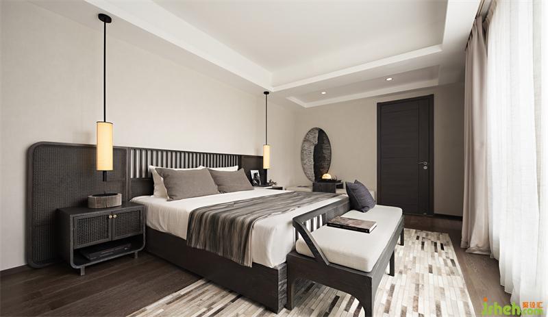 三层私密的主卧室选择低矮的床榻,席地铺设。藤制围屏,充满丰富的南国质感,床侧设置榻,附属饮茶功能以便临时小憩,丰富了生活场景。