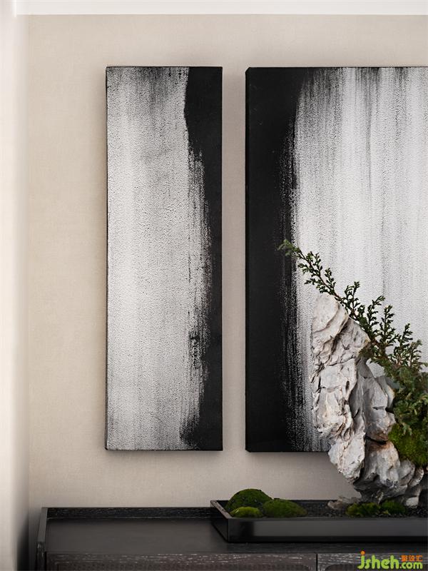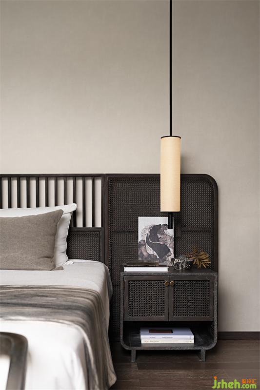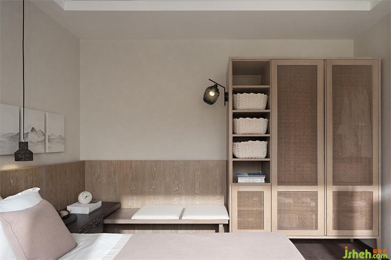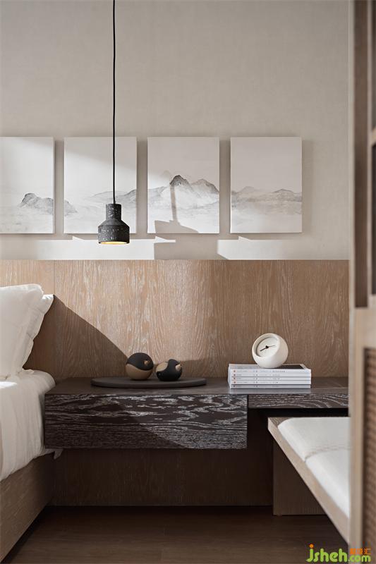 次卧床榻一体,L型边榻与陈列柜相结合,呈现出一种素朴的原木感,同时配合局部的藤艺编织,柜架被赋予明式家具的灵魂,疏朗灵秀。山水画被切割成连续感的“胶片”,蒙太奇般的在墙上打开一扇扇“小窗”,东方的清丽素雅之美在空气中弥漫。