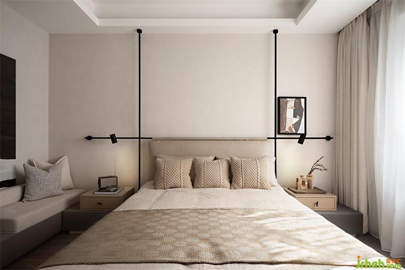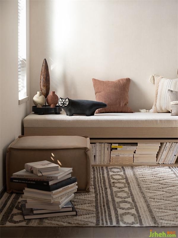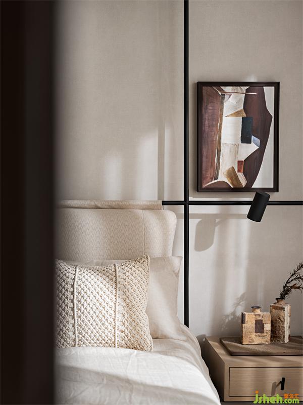 次卧中浅色的格调,被床头壁灯的暖光点亮。精致的原木床头柜、亚麻床品和棒针粗毛线编织的可爱抱枕,一种小而美的舒适感,萦绕在空气中。