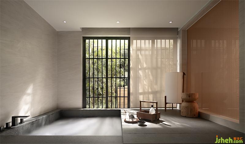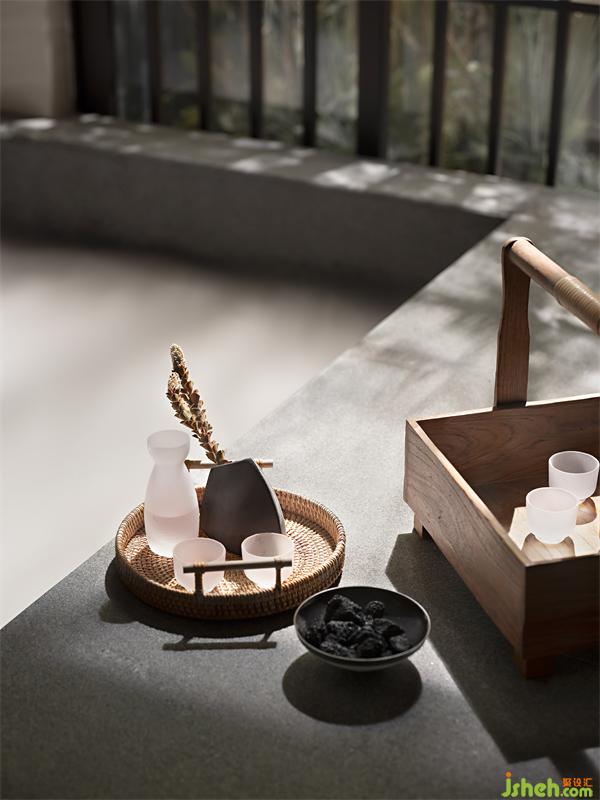 下叠餐厨空间与汤泉区紧密相连,修竹几杆自成遮蔽的风景。超大浴池带来的是“温泉水滑洗凝脂”的惬意,加之池边提盒中梅子清酒,小酌一杯的微醺感,度假的心情隐然其中,妙不可言。