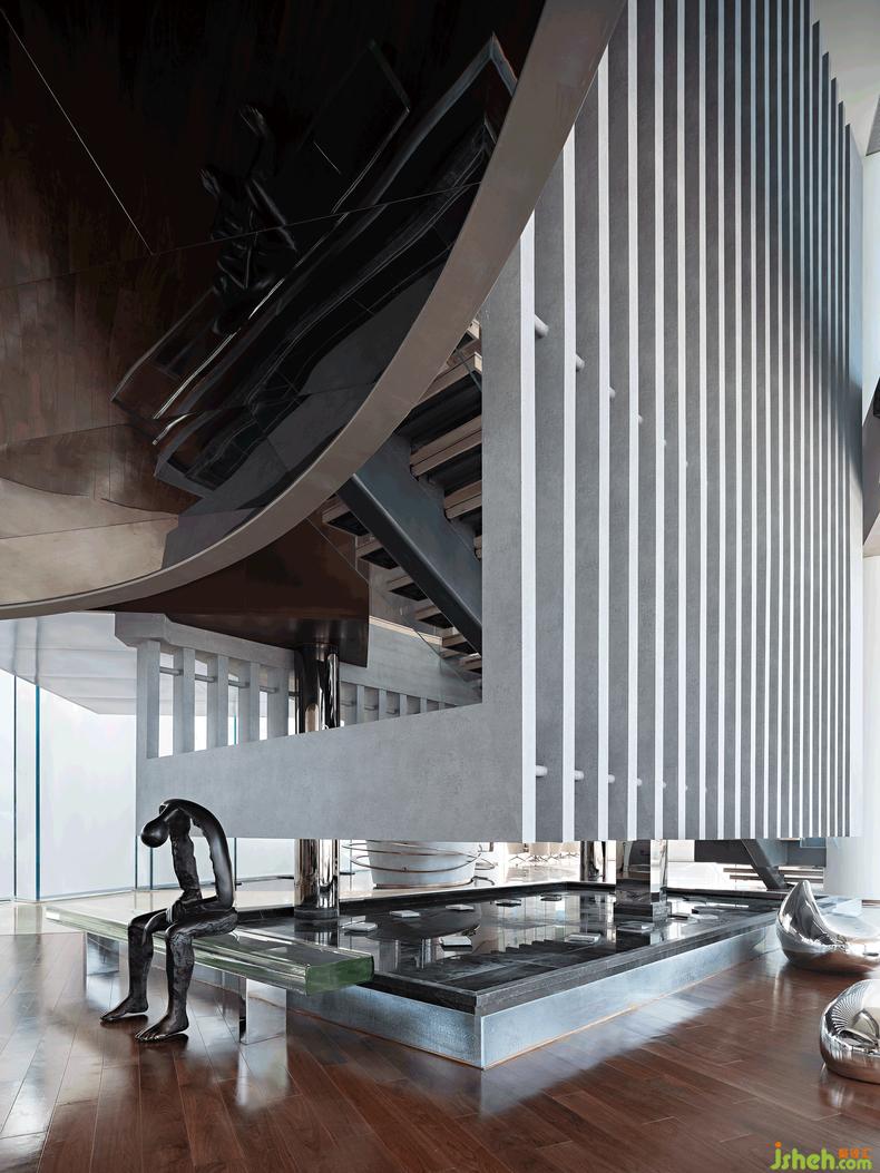 建筑大师赖特曾说,建筑是用结构来表达思想的科学性艺术。空间中二层穿插体块,以解构主义风格斜刺出挑,聚拢成突破性的视觉焦点,为空间内海洋因素的引入,搭建出“舞台背景”。在地性体现在陈设的考量上,以漩涡为灵感,前台以金属飘带自由缠绕,配合顶部艺术装置上下呼应,再由镜面天花倒映倍增了空间感,将大海充满力量的生命动力和柔性之美表达得恰到好处。