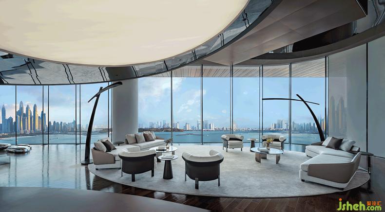 商务接待区,经过圆弧型地毯,分出围合形态的“小岛”,这些流线型线条与游艇设计如出一辙,潜移默化中注入奢华和运动基因。落地窗外是无敌美景,让人仿佛置身游艇甲板上凭海临风,无比惬意。