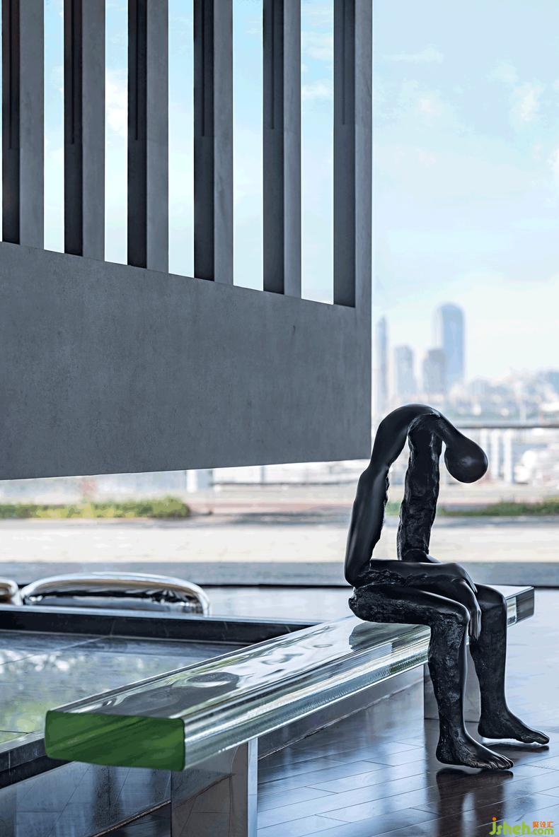 长凳人物,仿佛具有罗丹的思想者的魅力,抽象的体量和粗粝的青铜,沐浴在日光中,共同构成一幅冥想场景,随即空间充满了深邃的哲思意味.