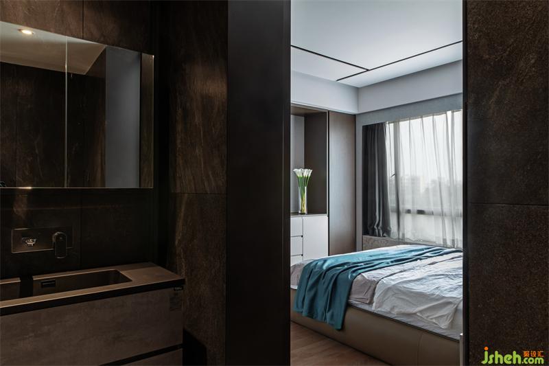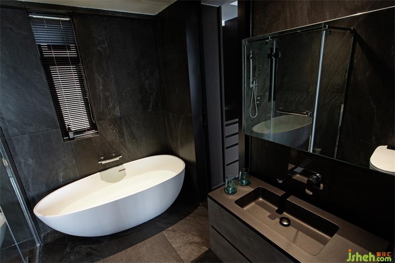 主卫生间运用深灰色瓷砖,反衬出洁具的洁白无瑕,加上暖黄的灯光,产生高级感。