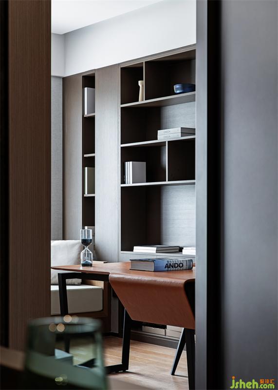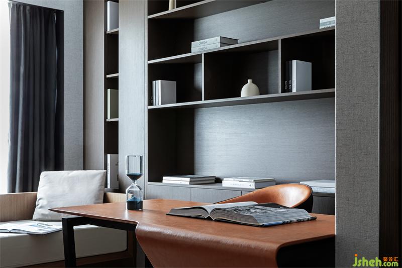 惠州家居设计将书柜做整体内嵌,增大空间利用率,同时立面效果更加平整简洁。有充足的藏书空间、有舒适的坐榻 、有书台,提供一个宜人的空间,满足业主日常的在家办公及阅读休息的功能诉求。