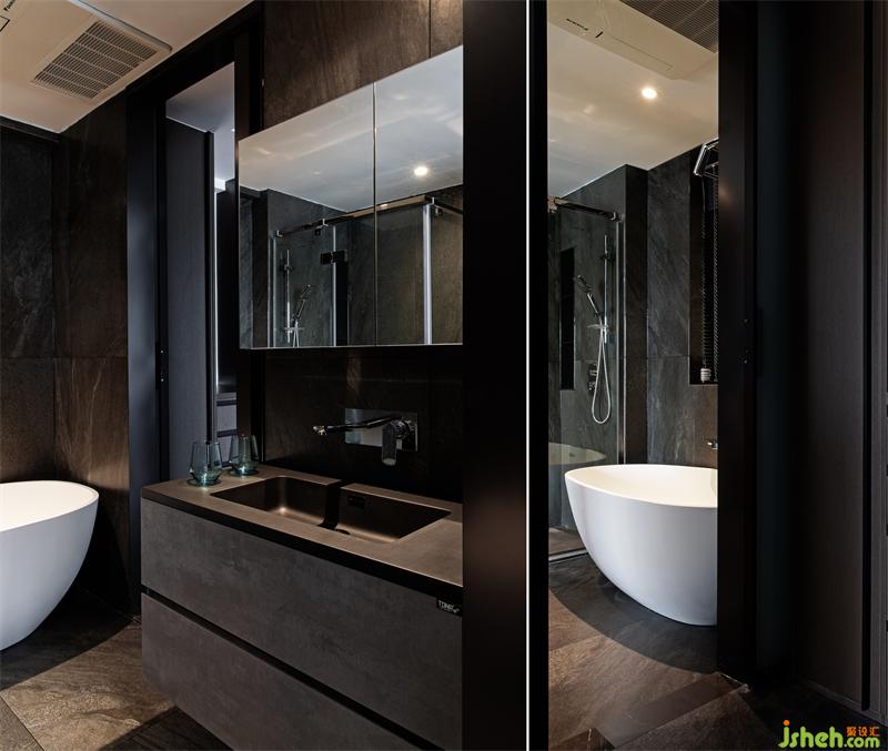 The main bathroom uses dark gray tiles to reflect the whiteness and flawlessness of the sanitary ware, and the warm yellow lighting creates a sense of luxury.