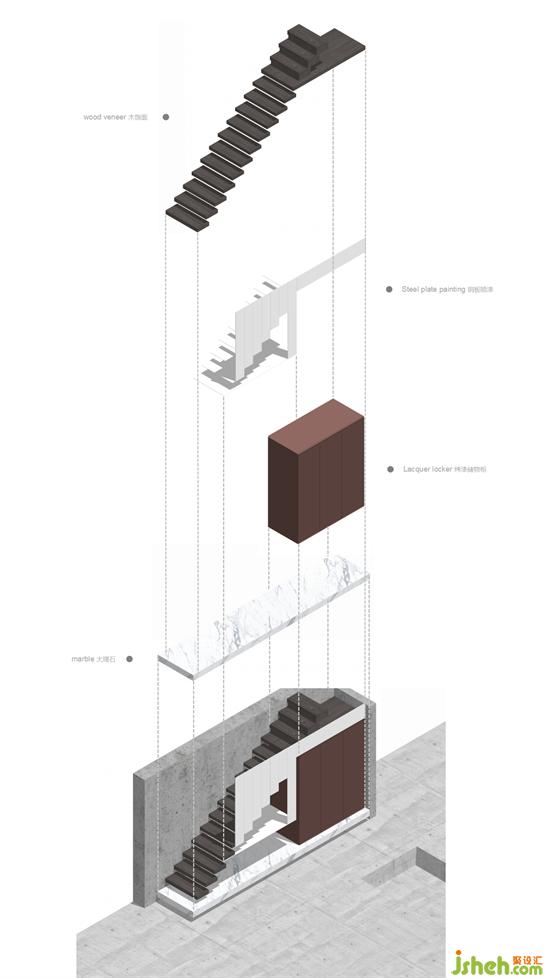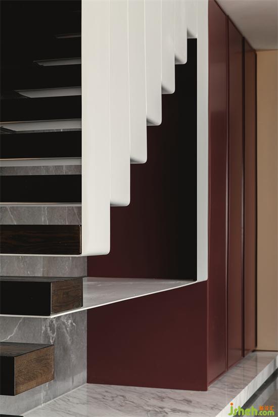 The staircase was carefully crafted as a highlight of the design. The subtle combination of wood and steel breaks the bulky feeling of the original concrete stairs. At the same time, the steel plate is used as a matching material and auxiliary pulling force in the second half, which has the richness of material vision and eliminates the possibility of the stairs being used for a long time. relaxation and deformation concerns.