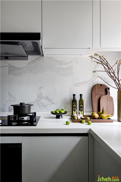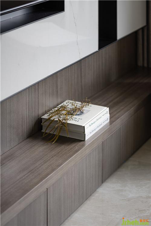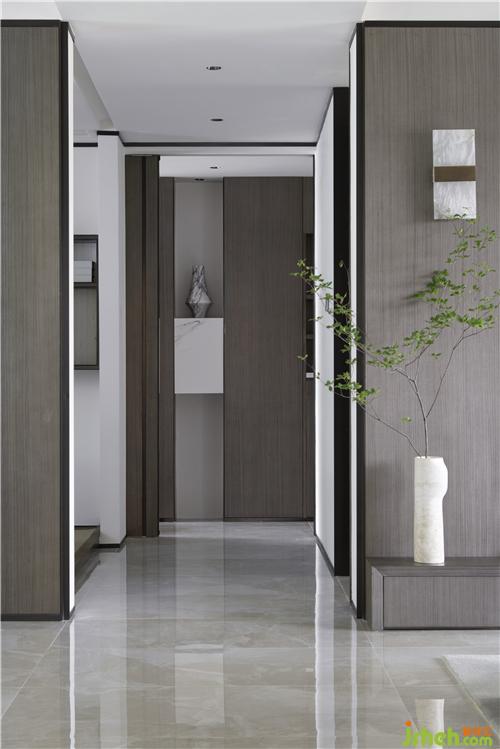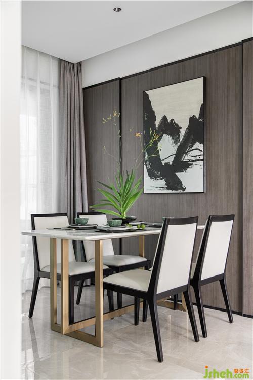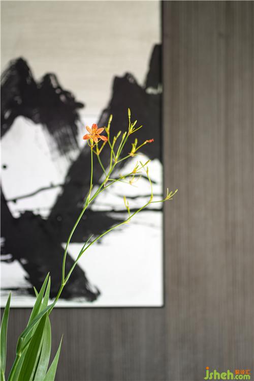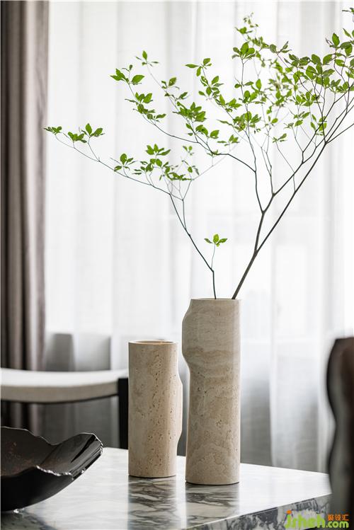 在这个家里,你尽可以徜徉在水墨的意境中,而没有强烈色彩的打扰。样板房设计黑白灰的过渡在这里呈现出细腻而丰富的层次,正如水墨画般自然晕染出一种东方的雅趣。而赭色的加入则为空间平添一分温暖的归属感。植物的绿意是点睛之笔,这抹自然的色彩与卧室等几处织物面料的颜色相呼应,如一股清风吹入房间,带着勃勃的生命力,点亮了整幅“画面”,让这张“画”即刻活了起来。