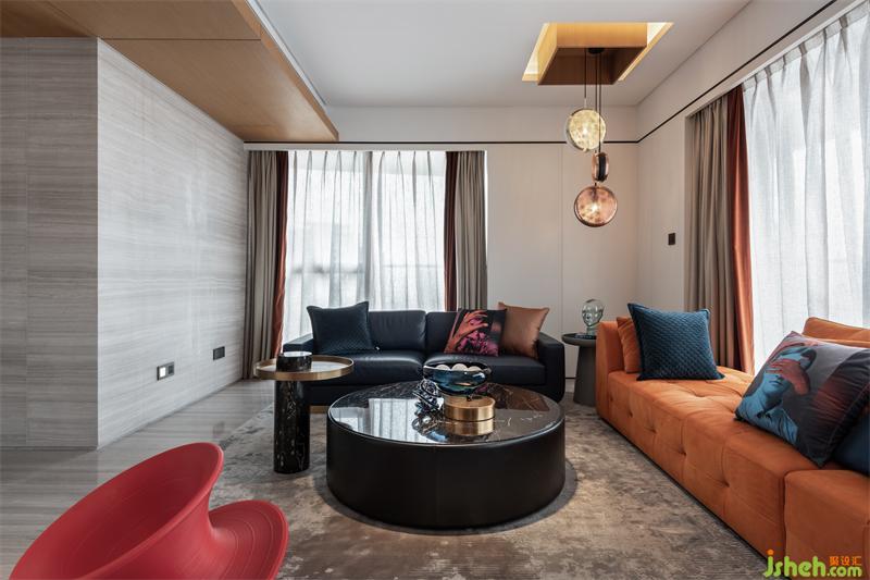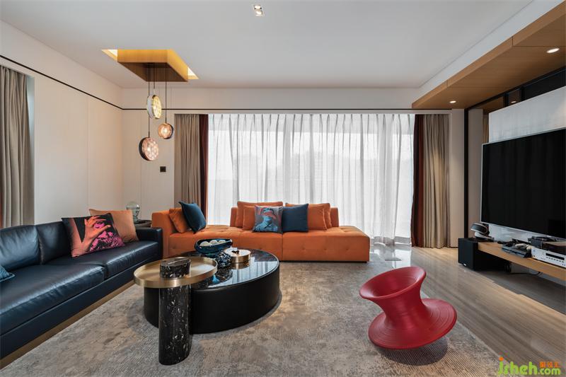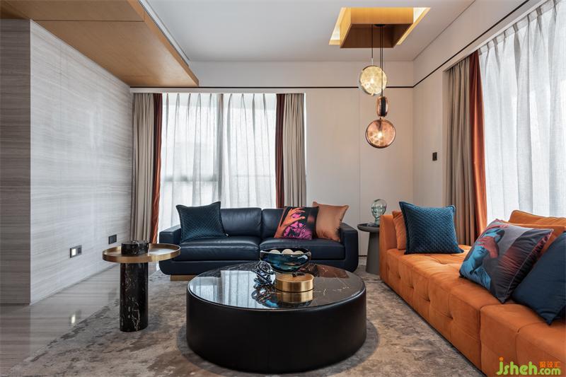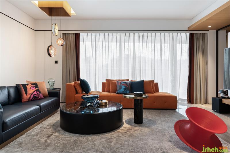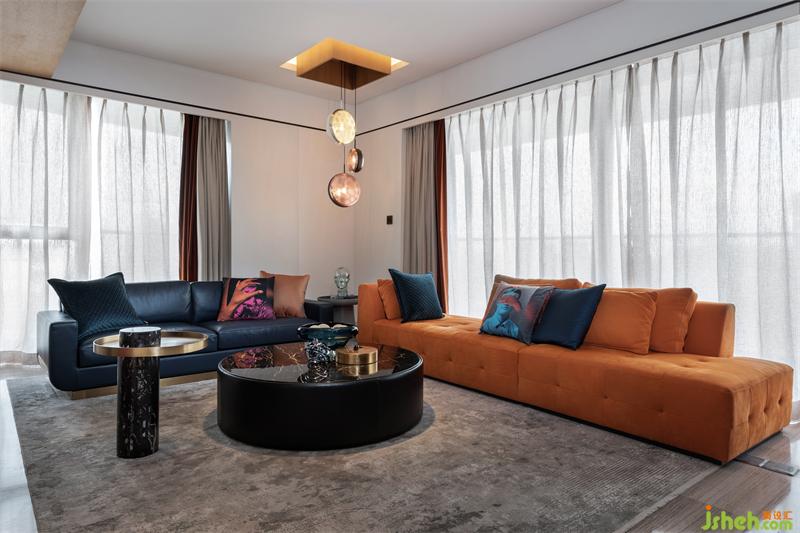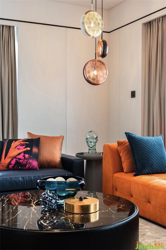 鲜橙的沙发倚窗而立,映着窗外的阳光,张扬着火热的生机与力量;侧边则搭配了布鲁氏蓝的背靠式沙发,中和的鲜橙带来的热闹,空间角落瞬显沉静内敛。正上方熠熠的金属吊灯,也参与着这场欢快的交响演奏。