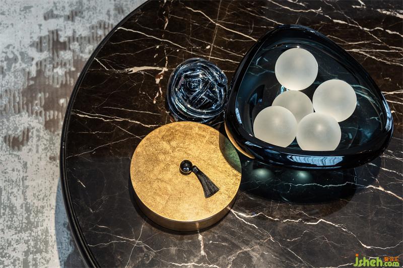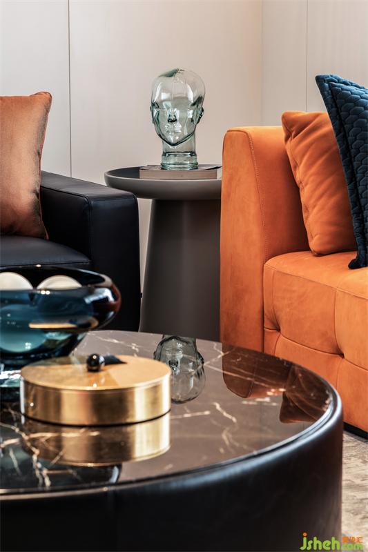 原石的茶几加上玻璃材质的器皿,让空间通透起来,即便是多重色彩的碰撞,也竟能完美叠加,繁复感尽消,反而增了些明亮与开阔。