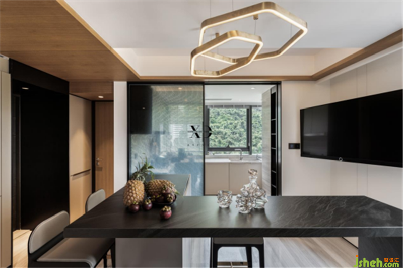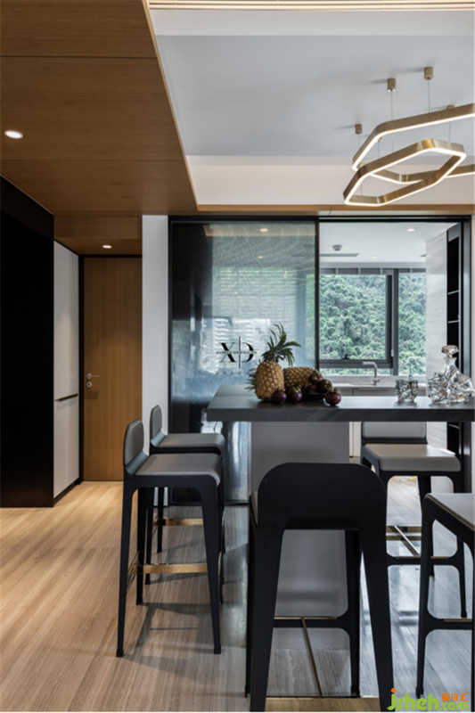 结合主人的生活所需,厨房及餐厅的功能性被削弱,社交性的考量也是如今年轻人更为亟待的需求。L型吧台搭配高脚椅,高级而精致的磨砂黑,时尚与艺术也从客厅延续。