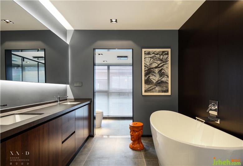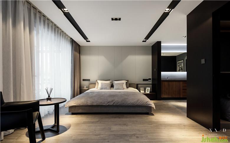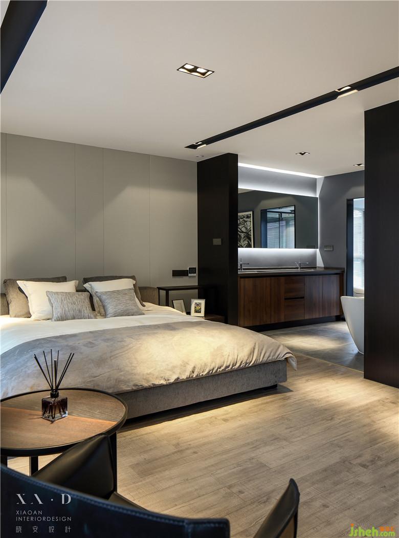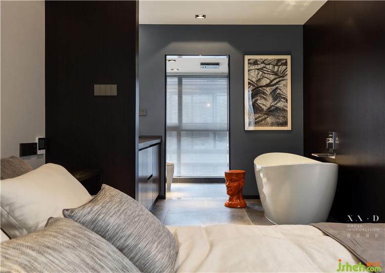 比较大胆的是,室内设计师将淋浴区的位置完全打开,浴缸是直接放在床边上的,这个设计在一般空间里是不会有的。整个空间上我们是一致采用了黑白灰色系的,呈现的方式以酒店式的套间主,这也是业主前期和我们沟通过想要呈现的效果。