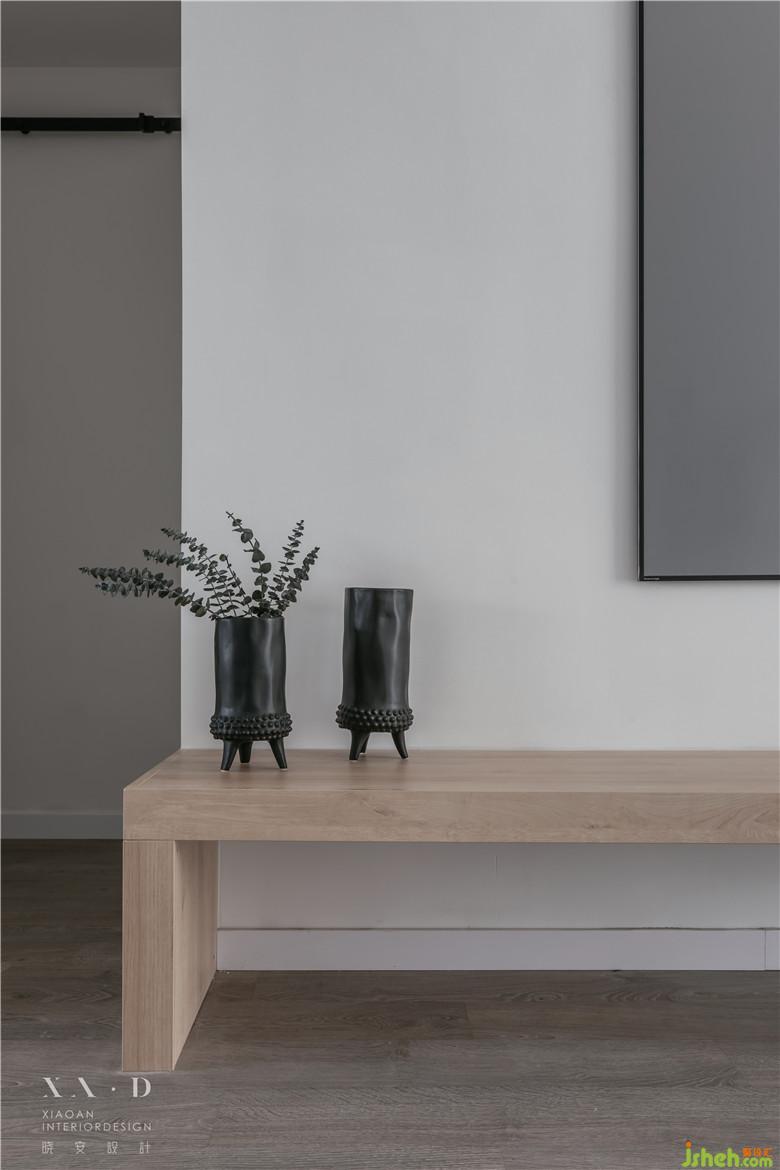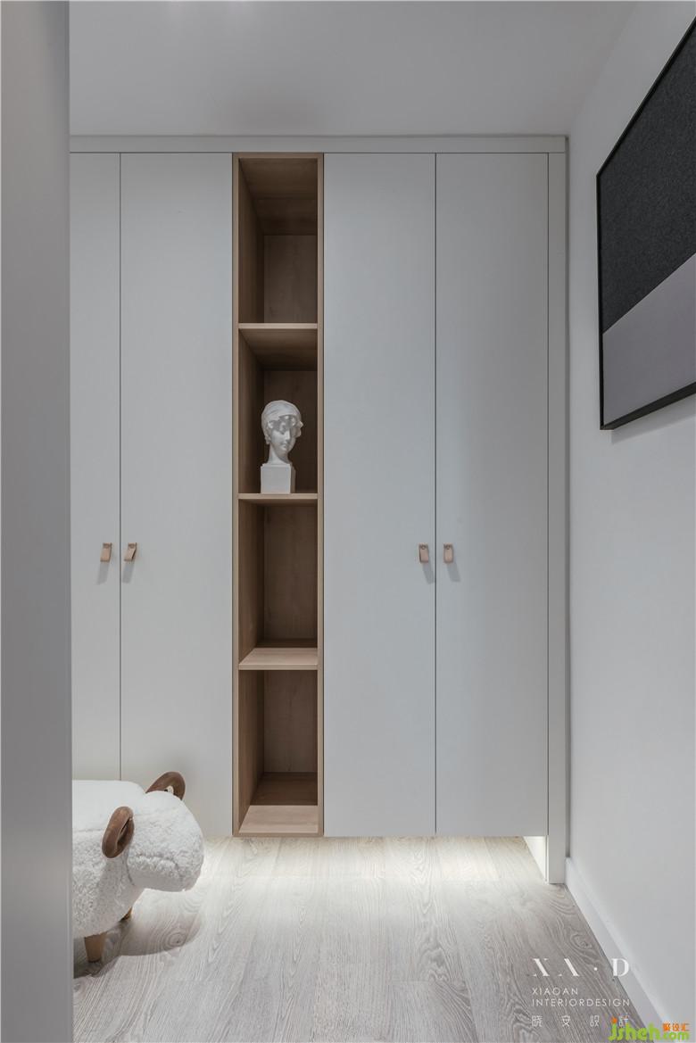 空间满足储物功能后,一缕木色从白色中退去。灯光营造了些许飘浮感,室内设计师没有采用硬质拉手而是选择相对柔软的皮拉手,绵羊座凳的选择都在表达业主内心的柔软。