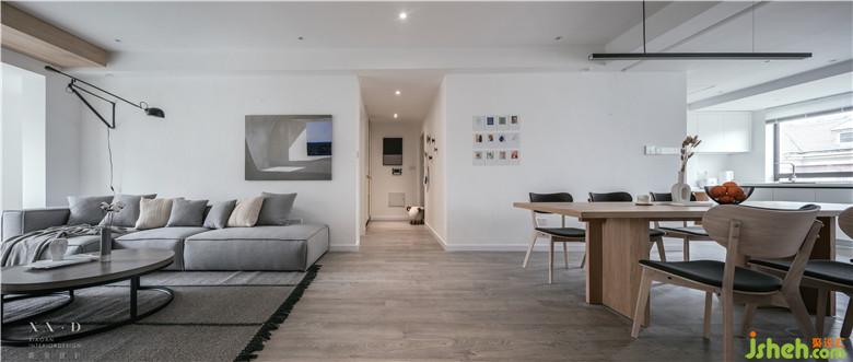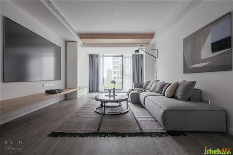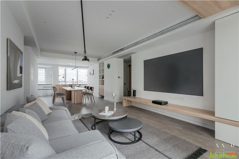 阳台与客厅相连,顶部用木色做台阶,弱化阳台门梁。室内设计师使用白色的定制柜体包裹着吊顶,增强了整体性的同时用一条木色贯穿,看似破坏,实则呼应。