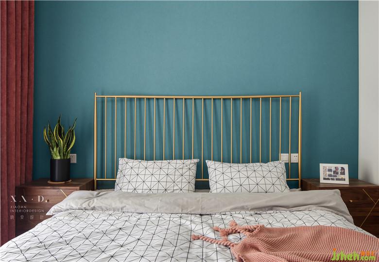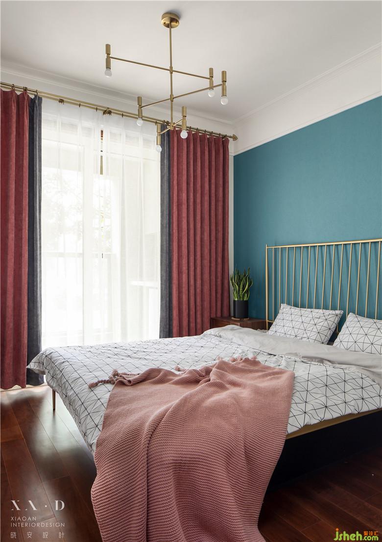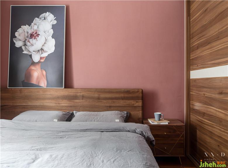 同样的,主卧室内设计师也是用的粉红色做墙纸,不过这抹红更深,搭配木材做的床头,显得更加搭配。