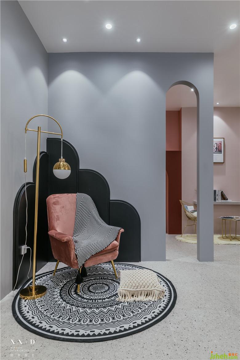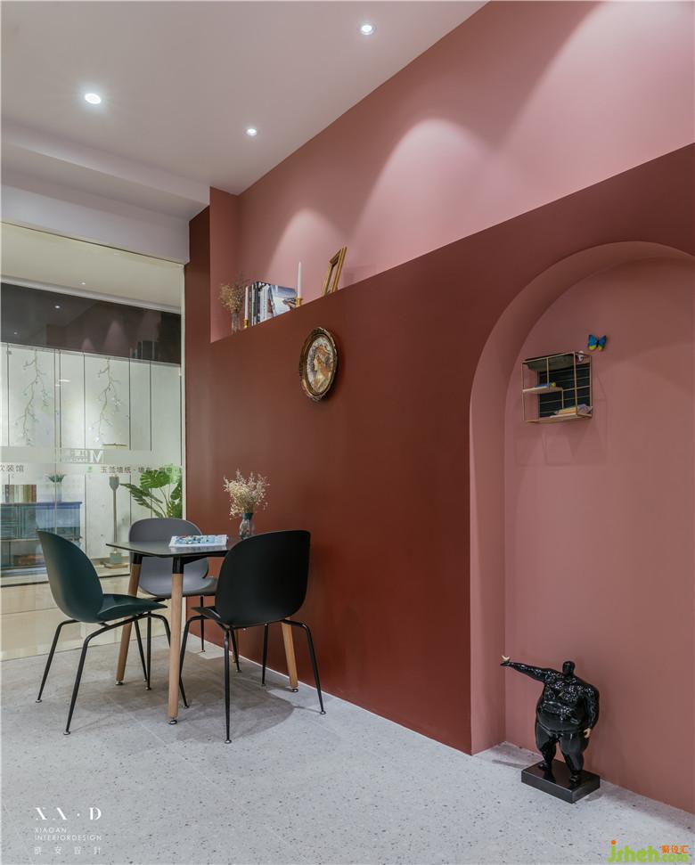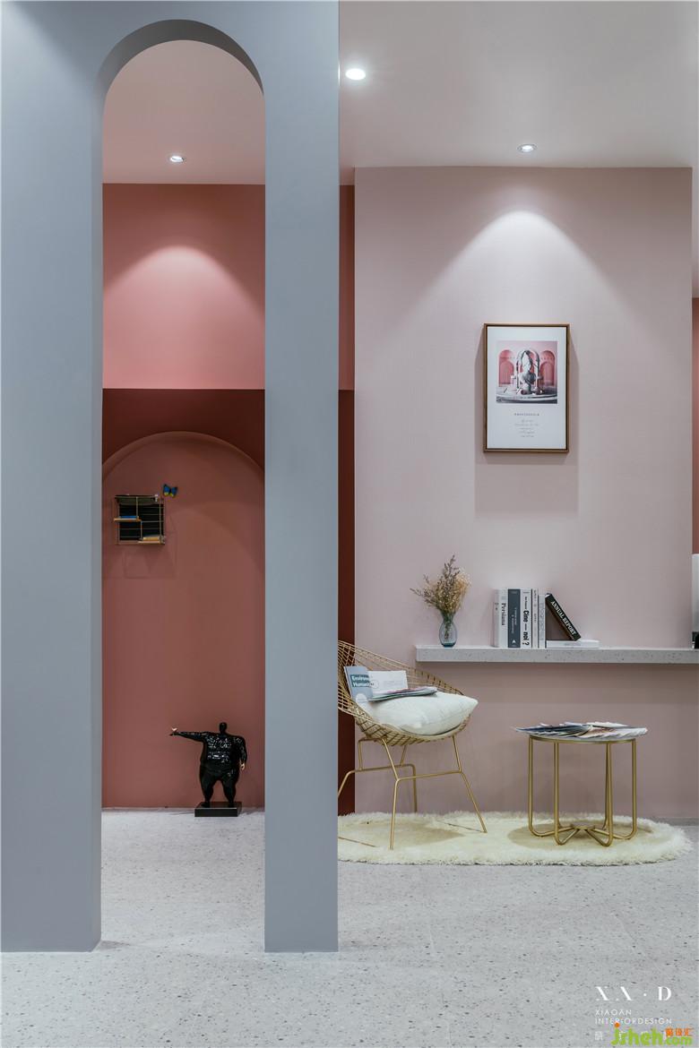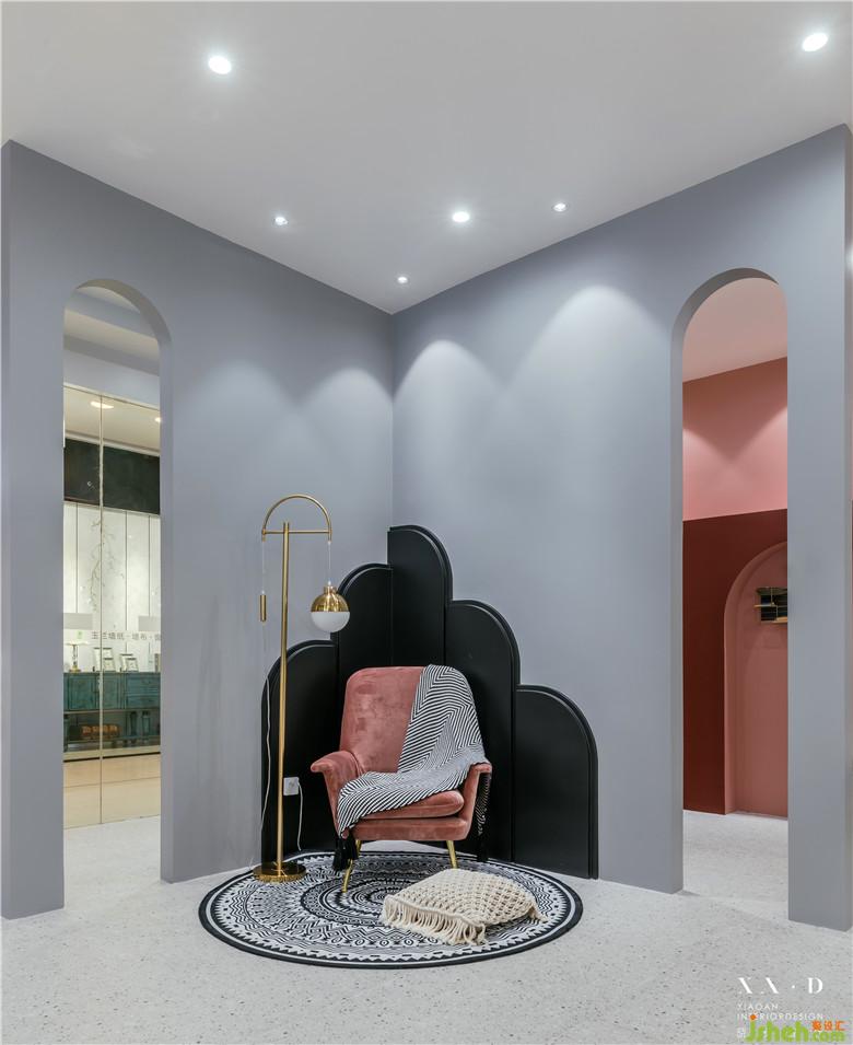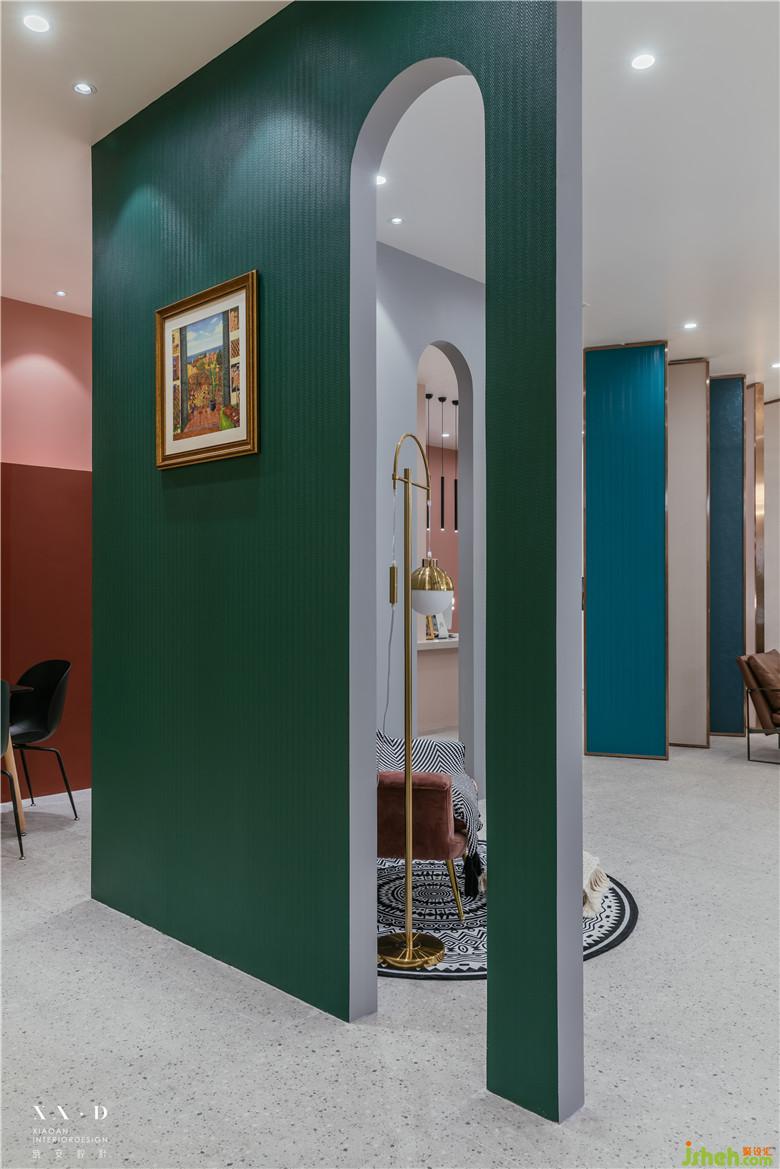 空间的划分,运用多拱门的方式呈现,使得空间的穿透性更具有趣味性。弧形设计,在空间呈现中更具有建筑语言,透过弧形门洞空间看到后面部分的墙面颜色,和前端空间有一个很好的穿插,使得颜色上有更多的互补和展示。室内设计师运用小景营造出更多有意思的空间氛围。