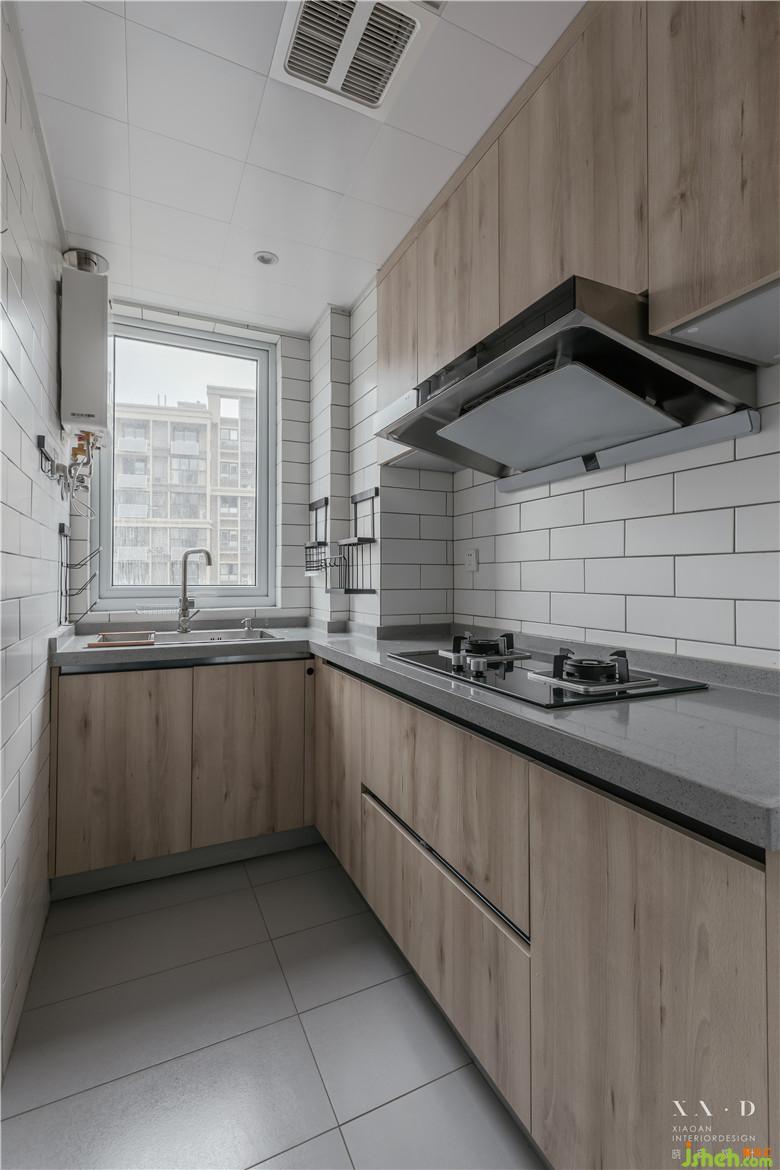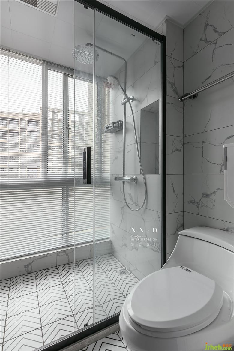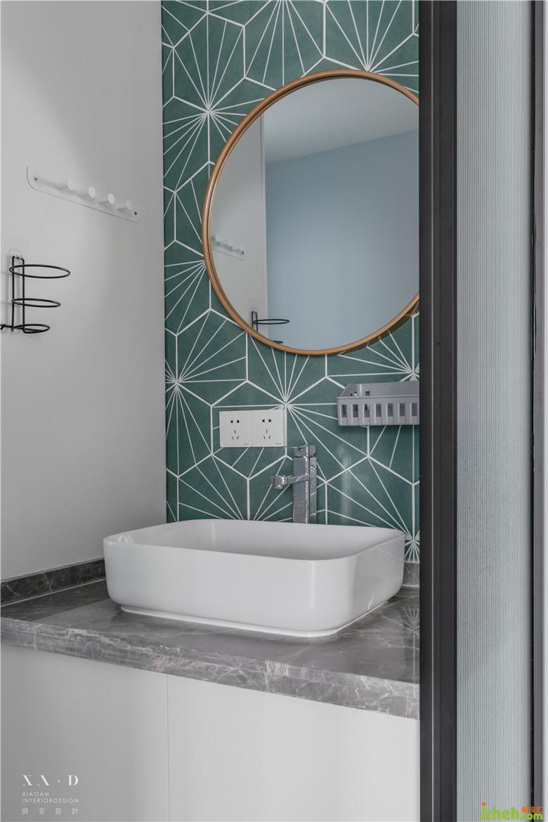 干区选择了绿色放射性的小花砖,用长虹玻璃做隔断,这样透光的同时节省了空间。卫生间里面选择了仿爵士白的砖和白色的花砖,提亮了卫生间的整体亮度,也使得空间更加干净。