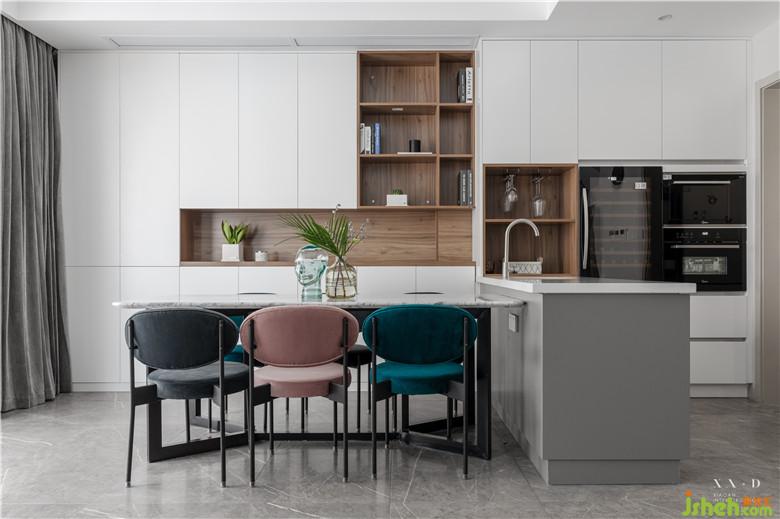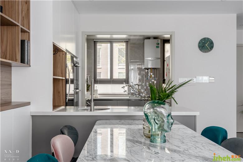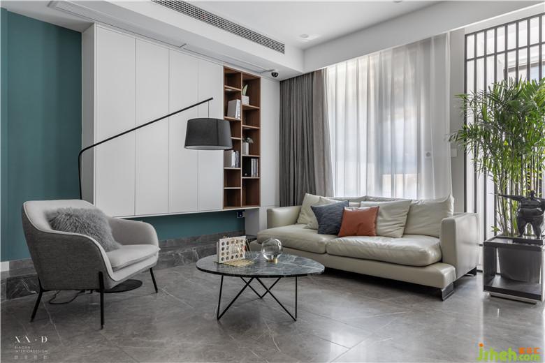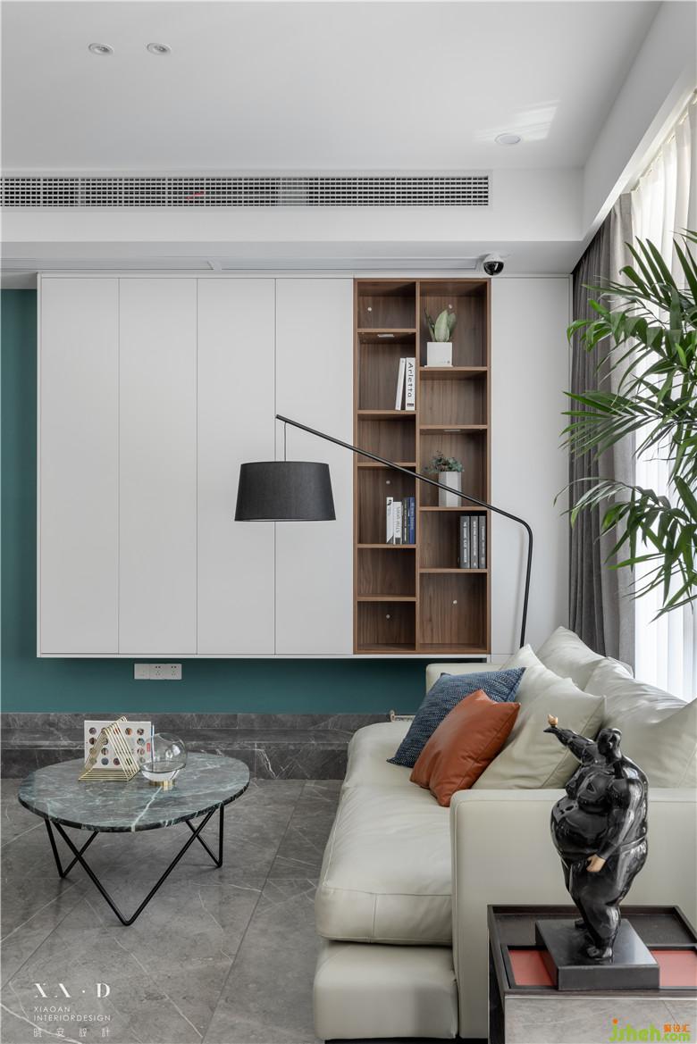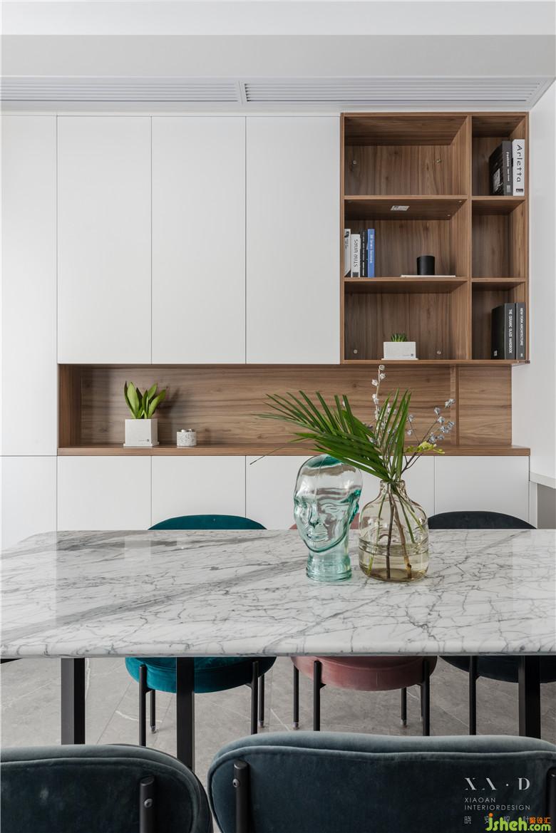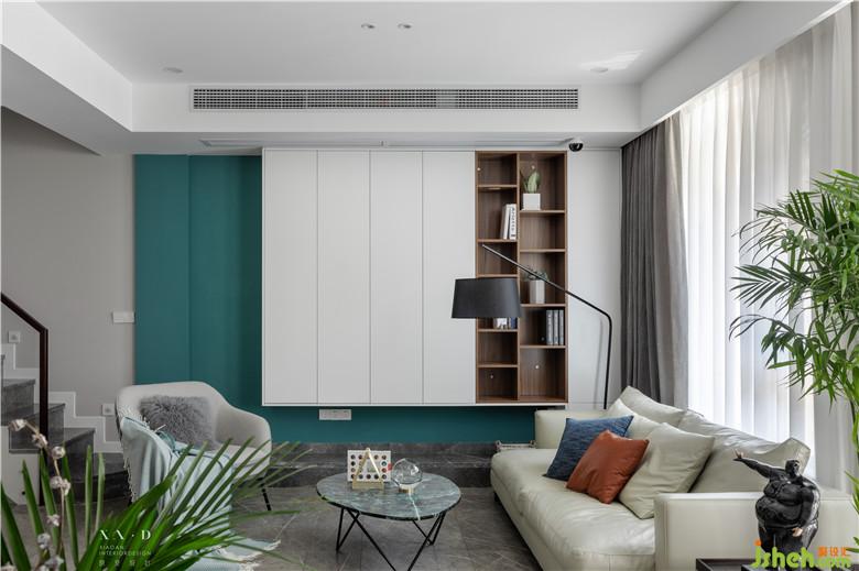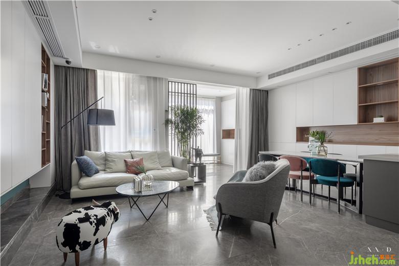 客厅空间整体色彩,明快轻松。没有被传统局限,根据家人的生活习惯,设置成平时喝茶、看书的地方。没有大体量的家具阻隔空间,让客厅与餐厅相连,扩大视觉效果。