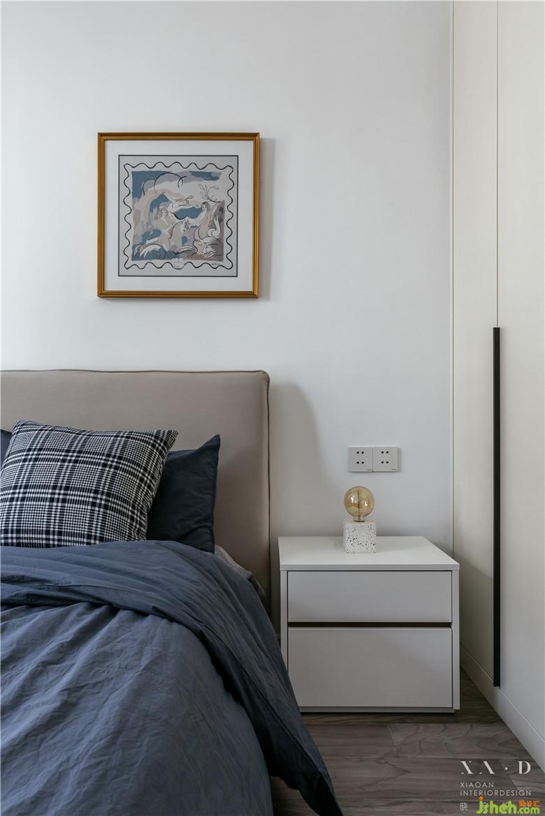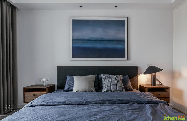 父母房采用了胡桃木家具,白色的墙面使用一幅蓝色的话点缀空间,与整个空间起到一个串联的作用。