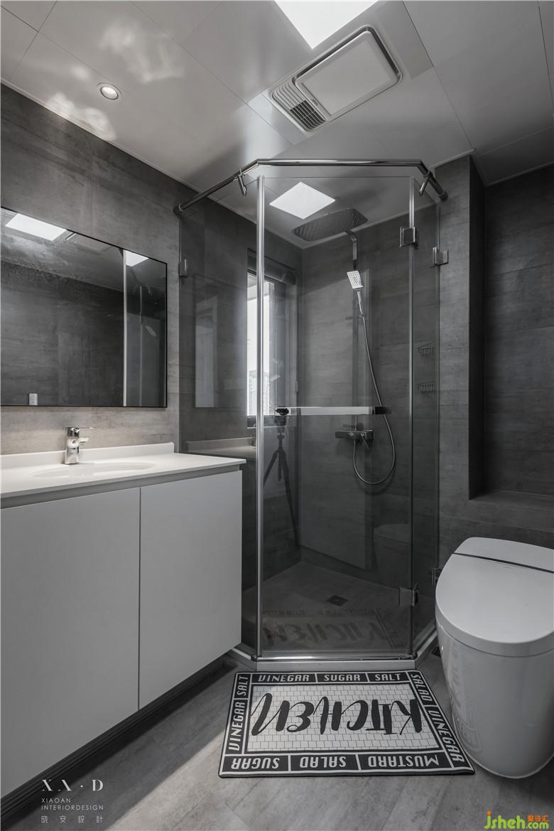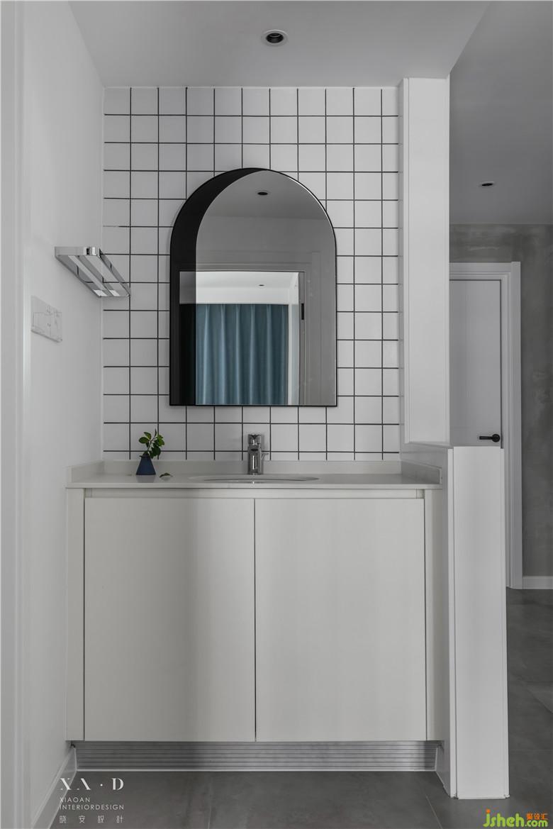 作为网红款的小白砖与拱形的镜子相映成趣,离地的台盆柜,巧妙的避开了卫生死角的产生。