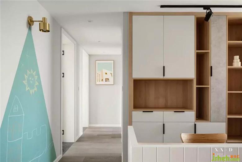 过道预留了蓝色黑板漆,室内设计师让孩子们有一个可以尽情绘画的地方。选择在过道做黑板漆,因为面对书房,这样孩子和家长的互动可以相互串联起来。过道端景的装饰画很好的和黑板漆的蓝呼应起来,相得益彰。