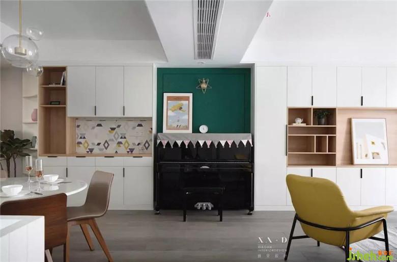 女儿的钢琴设计在过道中间位置,客厅柜体设计中预留出来的空间放置钢琴。墙面的颜色上选用了祖母绿色,增加空间的色彩。从单一的空间里面突显出来,既有装饰性的效果又能让女儿在练琴的时候不那么枯燥的面对着白墙,跳跃的颜色给人的心理会有疏导作用。