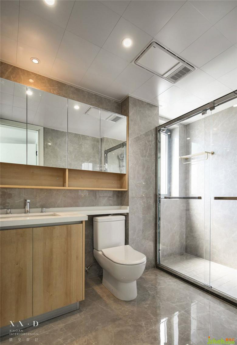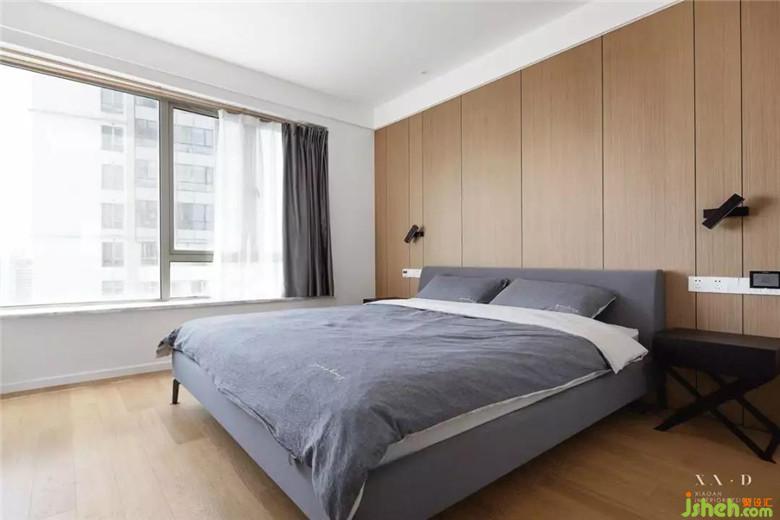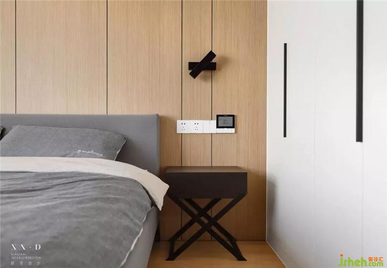 主卧室的风景是最好的,坐在床边就能看到美丽的金鸡湖风景。空间上没做过多的设计,背景上使用了整面木饰面,木饰面的比例分割,预留的工艺缝使得空间温馨又带有现代的气息。可调节的床头壁灯很好的解决了夜晚看书时所需要的照明。