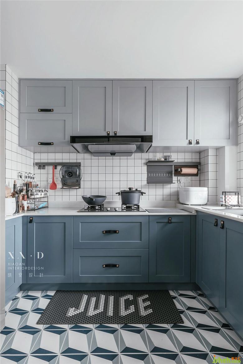 灰蓝色橱柜线条流畅,有点复古味道,但花样独特的地砖又带来几分新潮和艺术美,两者相交,别有趣味。