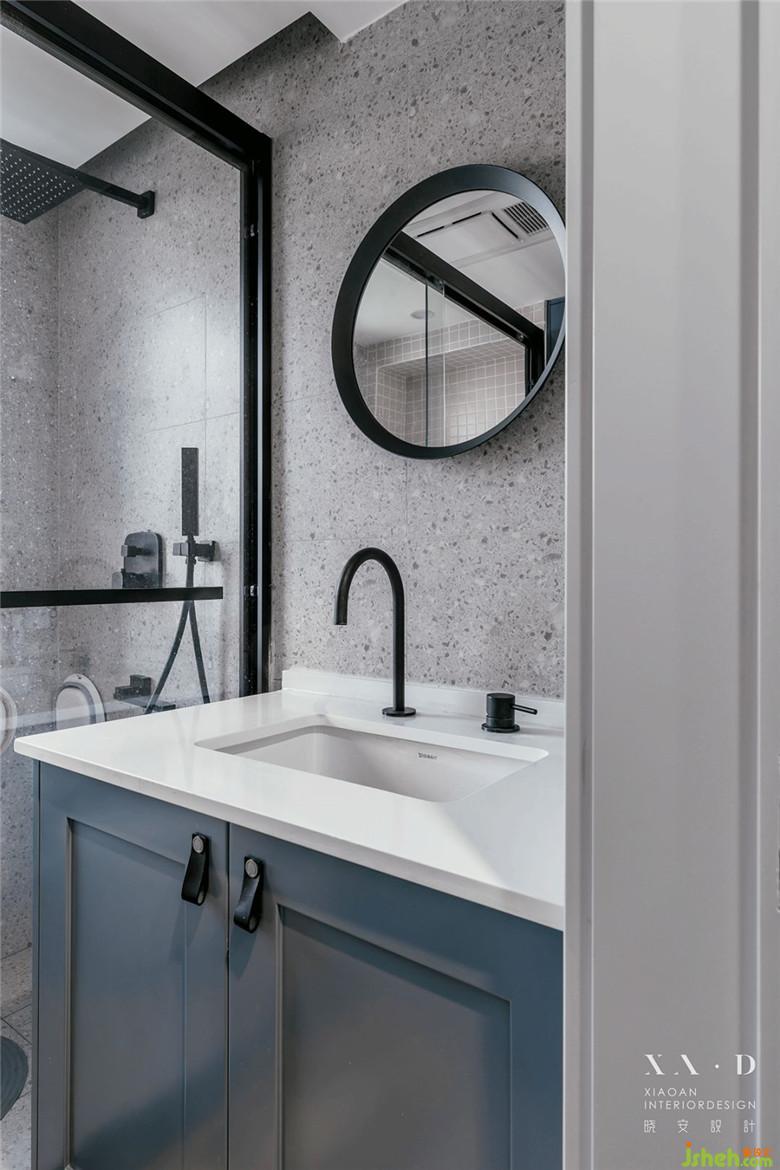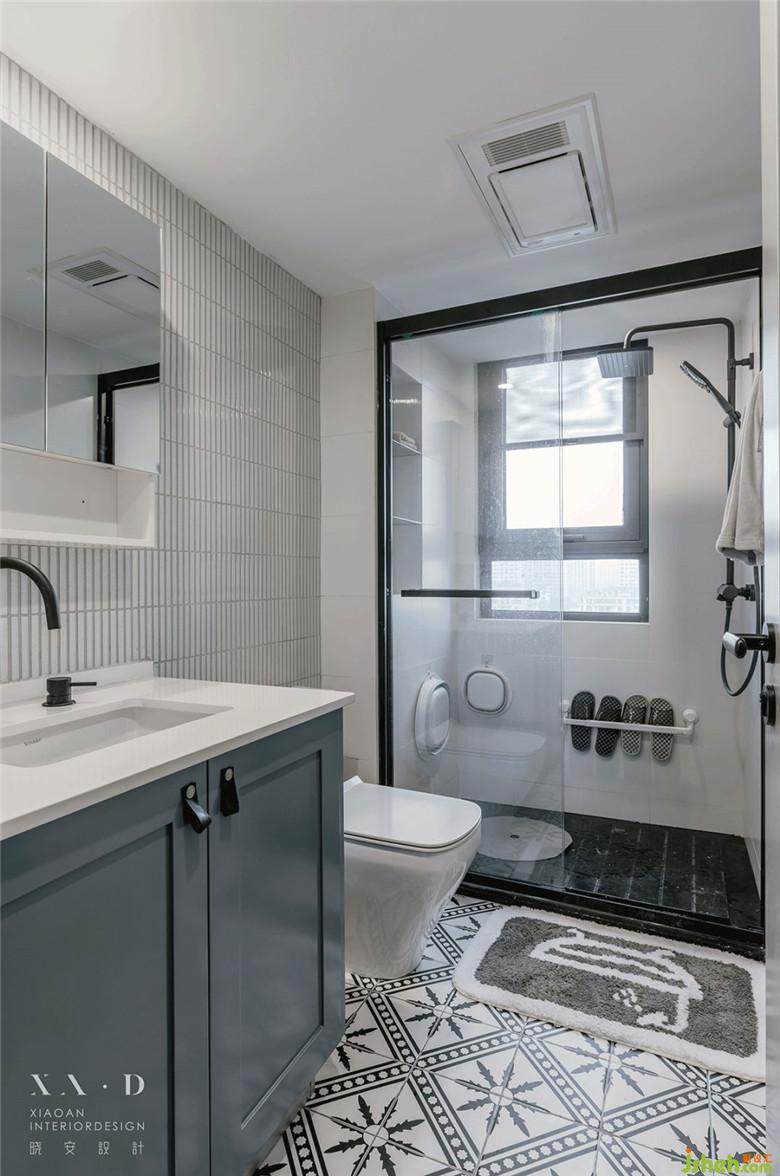 卫浴配色清雅大方,让人放松心神,吸水地毯、装修公司设置置鞋架等小设计周到贴心,是生活里的小确幸。