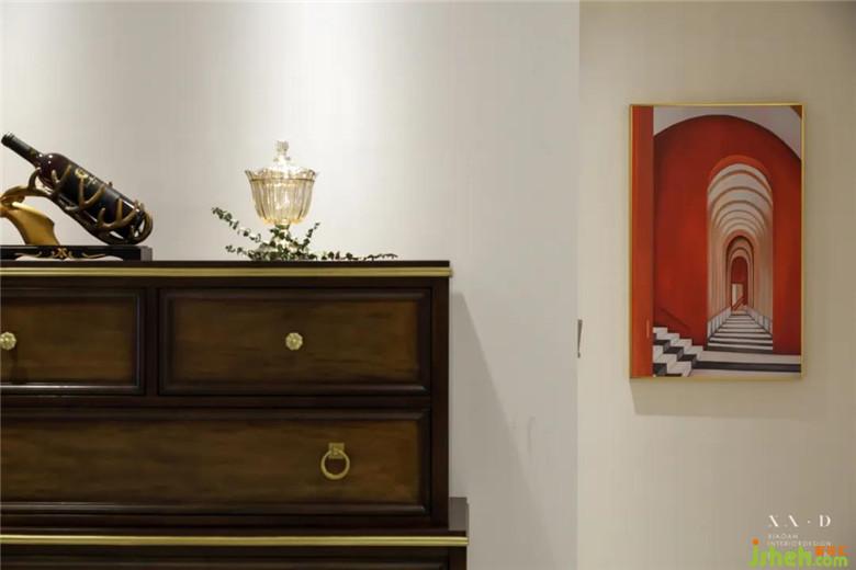深木色的八斗柜旁,红色调的小画显得尤为醒目,又与窗帘上的一抹红相映成趣。极简的黑白餐桌椅,大面积留白的空间,不会抢夺美食的主角光环。