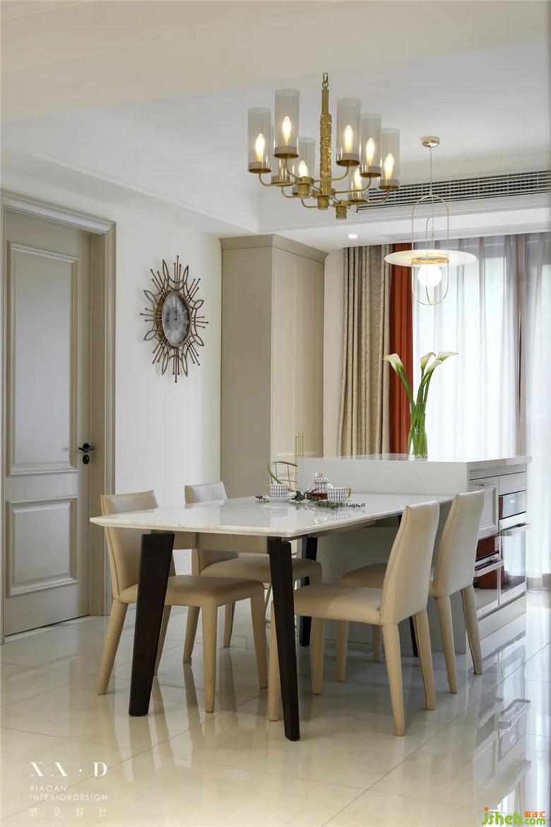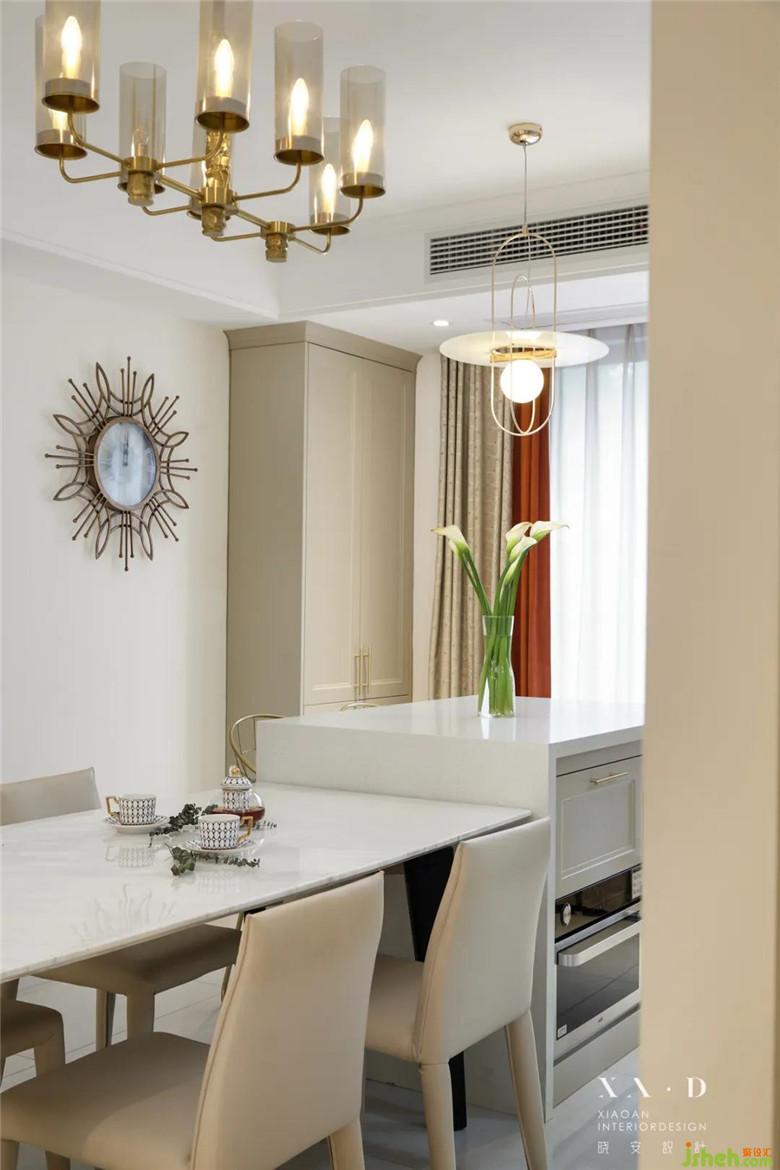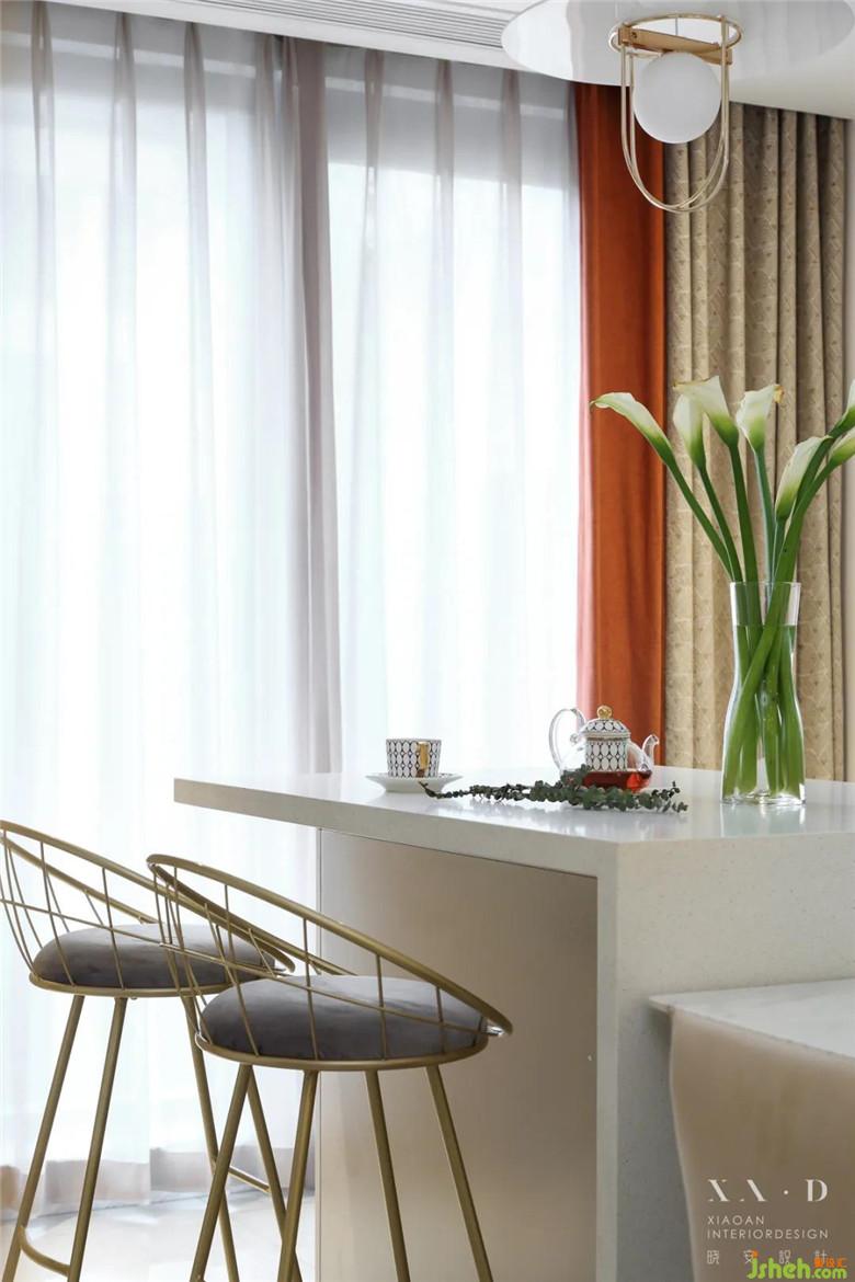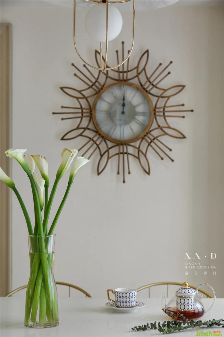 午后闲暇,铜制的花形时钟让时光流得更慢。纤细的金属高脚椅,舒适而自由。坐在岛台上煮茶看花,午后的阳光透过窗户照射进来,浑身暖融融,那一刻,就懂得了装修公司设计中流动的节奏感。